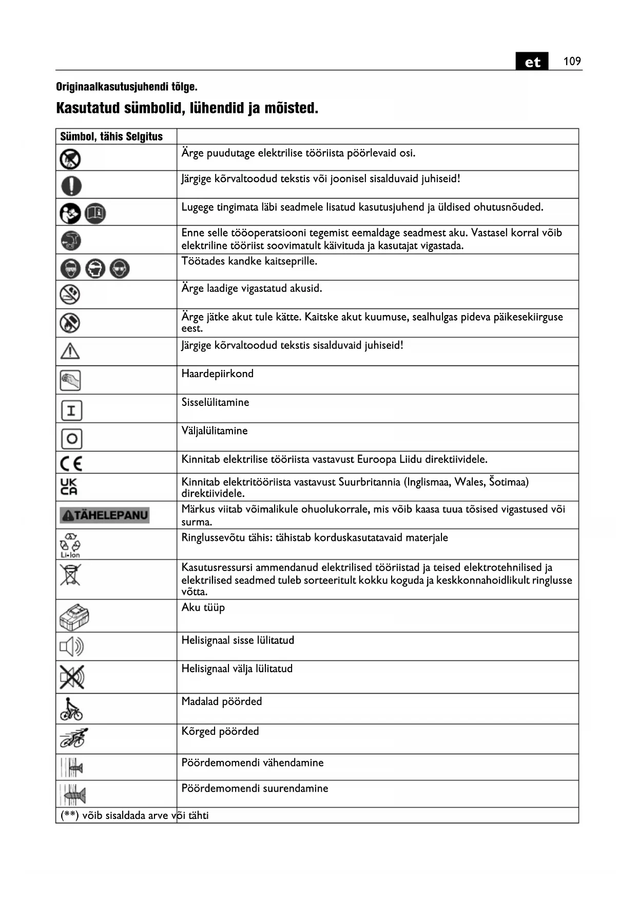 Originaalkasutusjuhendi tõlge. Kasutatud sümbolid, lühendid ja mõisted. Sümbol, tähis Selgitus Ärge puudutage elektrilise tööriista pöörlevaid osi. Järgige kõrvaltoodud tekstis või joonisel sisalduvaid juhiseid! Lugege tingimata läbi seadmele lisatud kasutusjuhend ja üldised ohutusnõuded. Enne selle tööoperatsiooni tegemist eemaldage seadmest aku. Vastasel korral võib elektriline tööriist soovimatult käivituda ja kasutajat vigastada. Töötades kandke kaitseprille. Ärge laadige vigastatud akusid. Ärge jätke akut tule kätte. Kaitske akut kuumuse, sealhulgas pideva päikesekiirguse eest. Järgige kõrvaltoodud tekstis sisalduvaid juhiseid! Haardepiirkond Sisselülitamine Väljalülitamine Kinnitab elektrilise tööriista vastavust Euroopa Liidu direktiividele. Kinnitab elektritööriista vastavust Suurbritannia (Inglismaa, Wales, Šotimaa) direktiividele. Märkus viitab võimalikule ohuolukorrale, mis võib kaasa tuua tõsised vigastused või surma. Ringlussevõtu tähis: tähistab korduskasutatavaid materjale Kasutusressursi ammendanud elektrilised tööriistad ja teised elektrotehnilised ja elektrilised seadmed tuleb sorteeritult kokku koguda ja keskkonnahoidlikult ringlusse võtta. Aku tüüp Helisignaal sisse lülitatud Helisignaal välja lülitatud Madalad pöörded Kõrged pöörded Pöördemomendi vähendamine Pöördemomendi suurendamine (**) võib sisaldada arve või tähti110