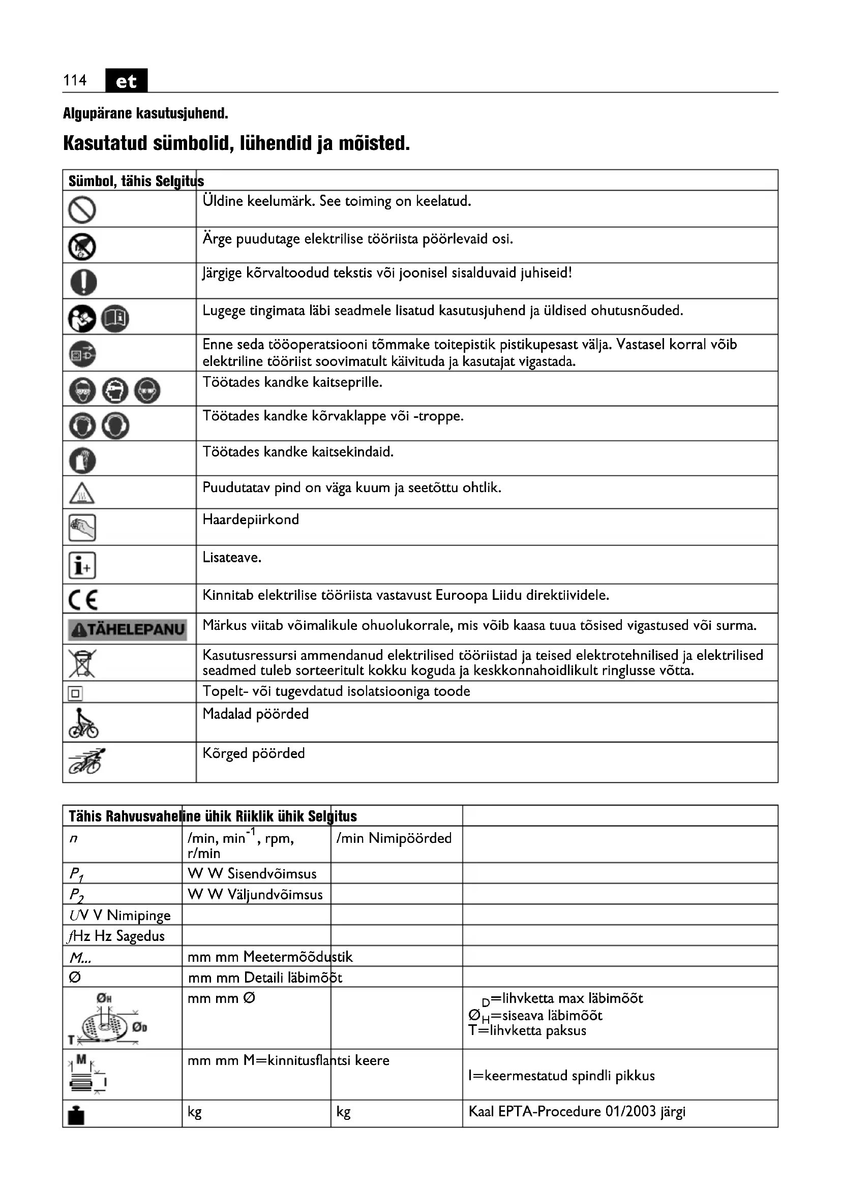 Algupärane kasutusjuhend. Kasutatud sümbolid, lühendid ja mõisted. Sümbol, tähis Selgitus Üldine keelumärk. See toiming on keelatud. Ärge puudutage elektrilise tööriista pöörlevaid osi. Järgige kõrvaltoodud tekstis või joonisel sisalduvaid juhiseid! Lugege tingimata läbi seadmele lisatud kasutusjuhend ja üldised ohutusnõuded. Enne seda tööoperatsiooni tõmmake toitepistik pistikupesast välja. Vastasel korral võib elektriline tööriist soovimatult käivituda ja kasutajat vigastada. Töötades kandke kaitseprille. Töötades kandke kõrvaklappe või -troppe. Töötades kandke kaitsekindaid. Puudutatav pind on väga kuum ja seetõttu ohtlik. Haardepiirkond Lisateave. Kinnitab elektrilise tööriista vastavust Euroopa Liidu direktiividele. Märkus viitab võimalikule ohuolukorrale, mis võib kaasa tuua tõsised vigastused või surma. Kasutusressursi ammendanud elektrilised tööriistad ja teised elektrotehnilised ja elektrilised seadmed tuleb sorteeritult kokku koguda ja keskkonnahoidlikult ringlusse võtta. Topelt- või tugevdatud isolatsiooniga toode Madalad pöörded Kõrged pöörded Tähis Rahvusvaheline ühik Riiklik ühik Selgitus
