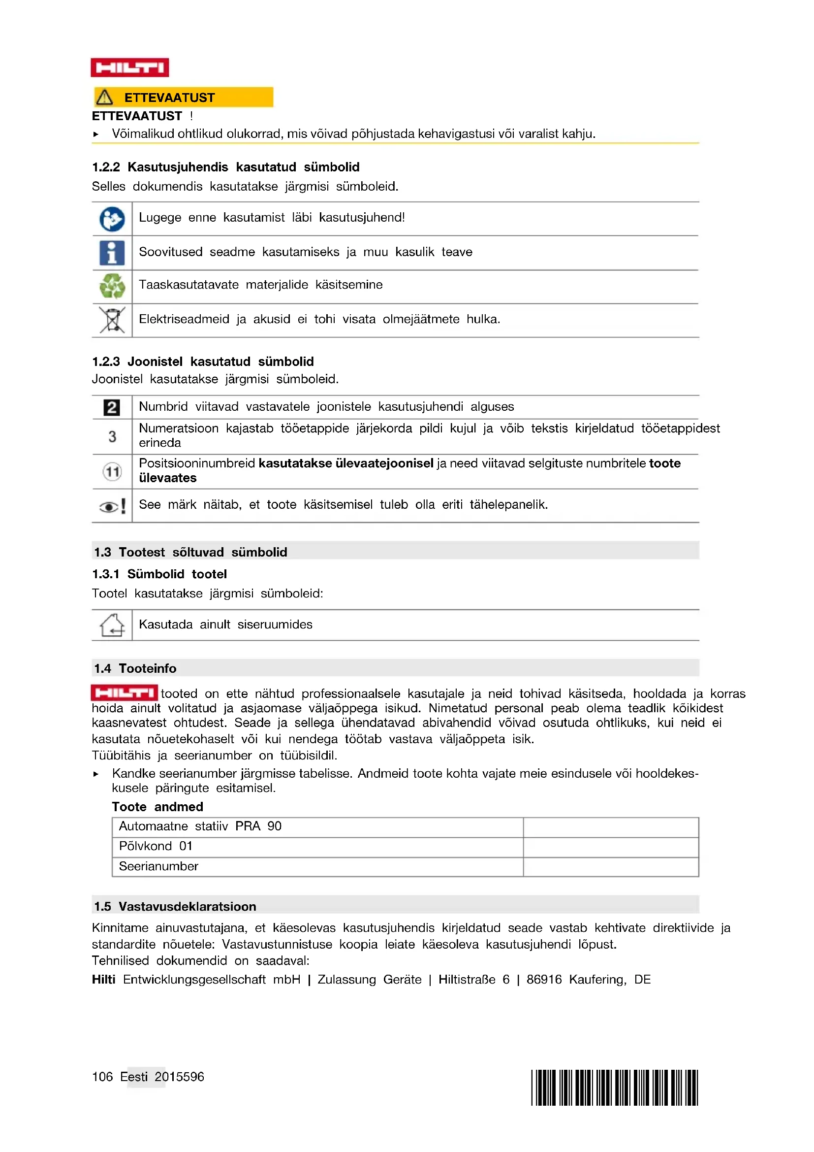 Kinnitame ainuvastutajana, et käesolevas kasutusjuhendis kirjeldatud seade vastab kehtivate direktiivide ja standardite nõuetele: Vastavustunnistuse koopia leiate käesoleva kasutusjuhendi lõpust. Tehnilised dokumendid on saadaval: Hilti Entwicklungsgesellschaft mbH | Zulassung Geräte | Hiltistraße 6 | 86916 Kaufering, DE*2015596* 2015596 Eesti 107 2 Ohutus