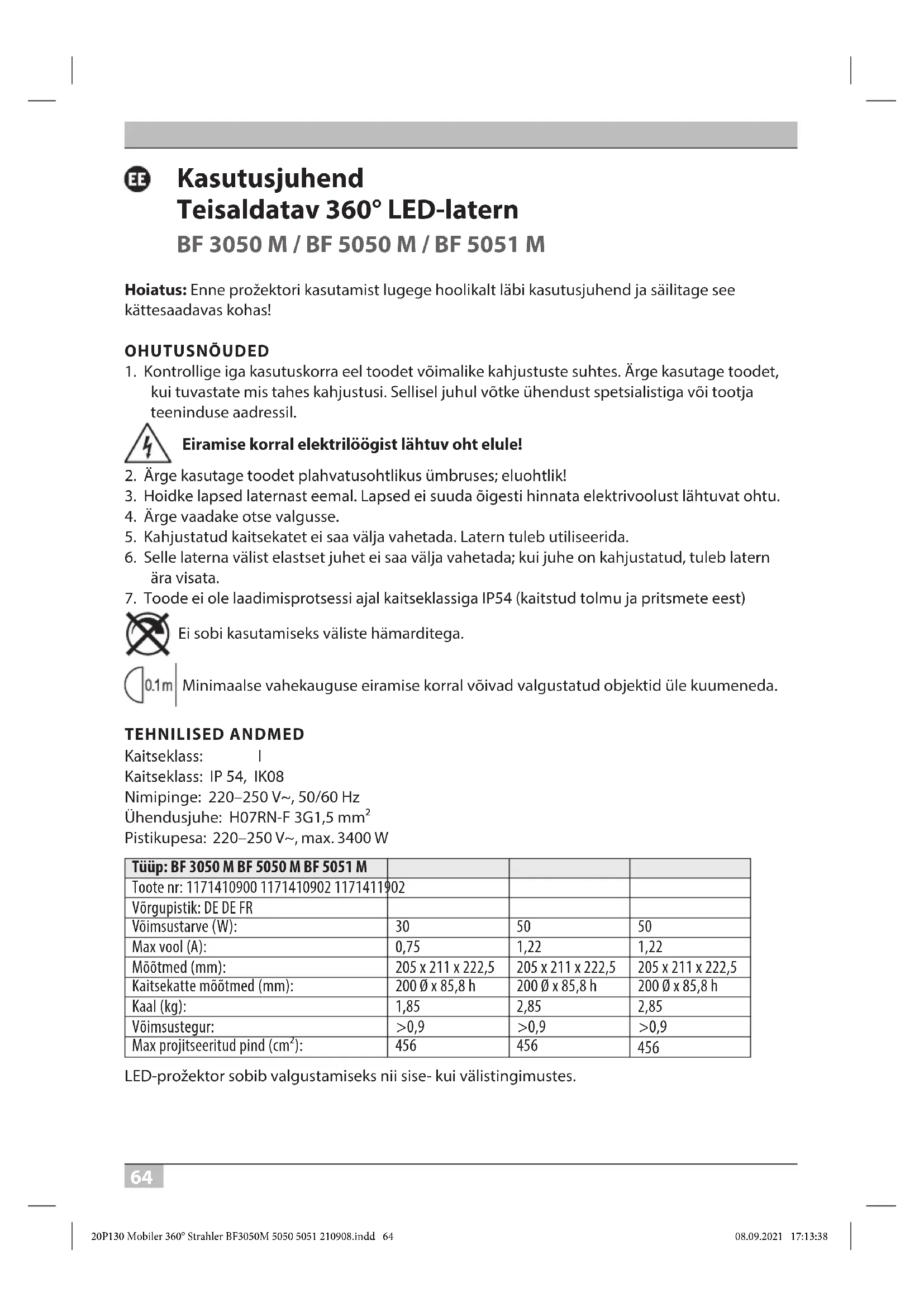 A declaração da UE de conformidade foi entregue ao fabricante. FABRICANTE Hugo Brennenstuhl GmbH & Co. KG Seestraße 1 – 3 · D-72074 Tübingen H. Brennenstuhl S.A.S. 4 rue de Bruxelles ∙ F-67170 Bernolsheim lectra technik ag Blegistrasse 13 · CH-6340 Baar Para mais informações, consulte por favor a área Service/FAQ’s no nosso sítio da Internet www.brennenstuhl.com. 20P130 Mobiler 360° Strahler BF3050M 5050 5051 210908.indd 6320P130 Mobiler 360° Strahler BF3050M 5050 5051 210908.indd 63 08.09.2021 17:13:3708.09.2021 17:13:3764 Kasutusjuhend Teisaldatav 360° LED-latern BF 3050 M / BF 5050 M / BF 5051 M Hoiatus: Enne prožektori kasutamist lugege hoolikalt läbi kasutusjuhend ja säilitage see kättesaadavas kohas!OHUTUSNÕUDED1. Kontrollige iga kasutuskorra eel toodet võimalike kahjustuste suhtes. Ärge kasutage toodet, kui tuvastate mis tahes kahjustusi. Sellisel juhul võtke ühendust spetsialistiga või tootja teeninduse aadressil. Eiramise korral elektrilöögist lähtuv oht elule!2. Ärge kasutage toodet plahvatusohtlikus ümbruses; eluohtlik!3. Hoidke lapsed laternast eemal. Lapsed ei suuda õigesti hinnata elektrivoolust lähtuvat ohtu.4. Ärge vaadake otse valgusse.5. Kahjustatud kaitsekatet ei saa välja vahetada. Latern tuleb utiliseerida.6. Selle laterna välist elastset juhet ei saa välja vahetada; kui juhe on kahjustatud, tuleb latern ära visata.7. Toode ei ole laadimisprotsessi ajal kaitseklassiga IP54 (kaitstud tolmu ja pritsmete eest) Ei sobi kasutamiseks väliste hämarditega. Minimaalse vahekauguse eiramise korral võivad valgustatud objektid üle kuumeneda.TEHNILISED ANDMEDKaitseklass: IKaitseklass: IP 54, IK08 Nimipinge: 220–250 V~, 50/60 Hz Ühendusjuhe: H07RN-F 3G1,5 mm²Pistikupesa: 220–250 V~, max. 3400 W Tüüp: BF 3050 M BF 5050 M BF 5051 M Toote nr: 1171410900 1171410902 1171411902 Võrgupistik: DE DE FR Võimsustarve (W): 30 50 50 Max vool (A): 0,75 1,22 1,22 Mõõtmed (mm): 205 x 211 x 222,5 205 x 211 x 222,5 205 x 211 x 222,5 Kaitsekatte mõõtmed (mm): 200 Ø x 85,8 h 200 Ø x 85,8 h 200 Ø x 85,8 h Kaal (kg): 1,85 2,85 2,85 Võimsustegur: >0,9 >0,9 >0,9 Max projitseeritud pind (cm²): 456 456