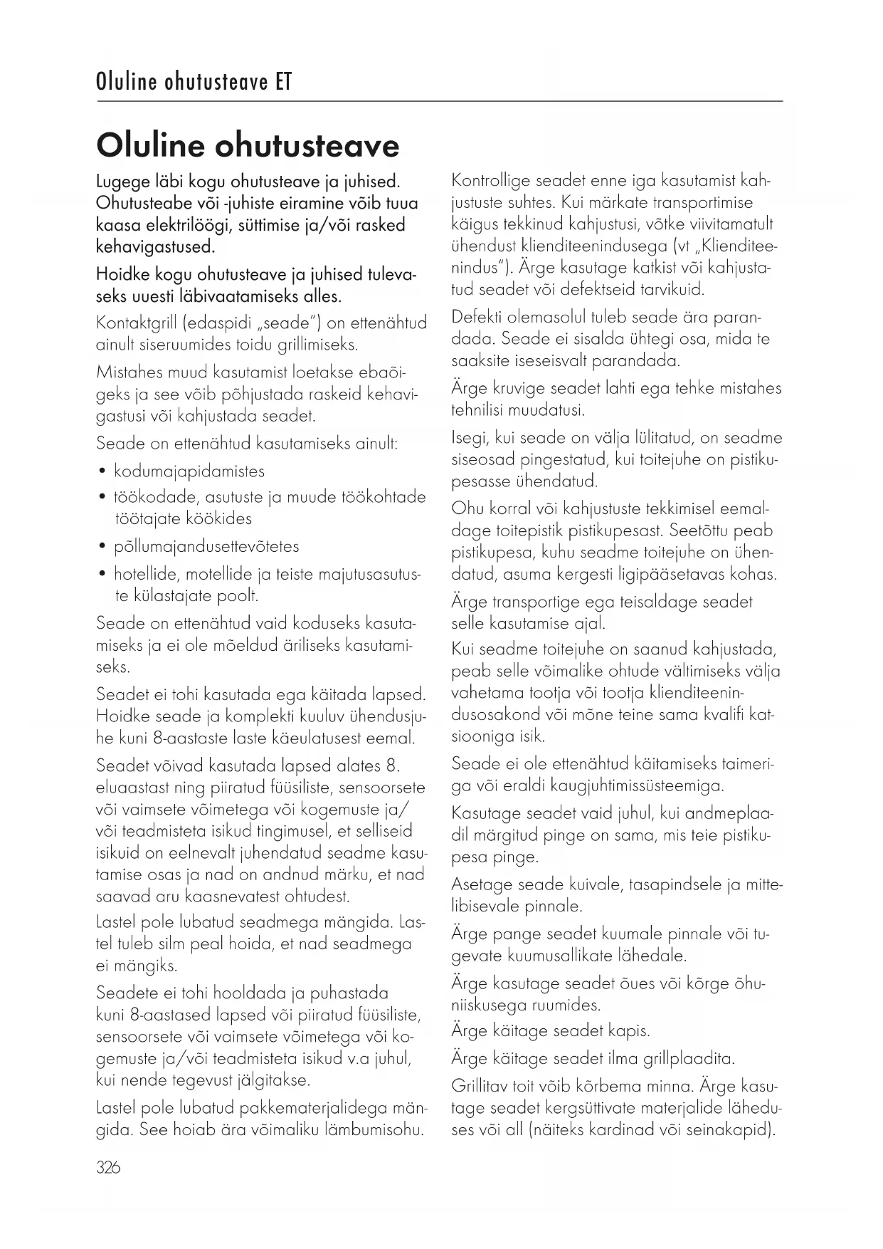 - hotellide, motellide ja teiste majutusasutus- te külastajate poolt. Seade on ettenähtud vaid koduseks kasuta- miseks ja ei ole mõeldud äriliseks kasutami- seks. Seadet ei tohi kasutada ega käitada lapsed. Hoidke seade ja komplekti kuuluv ühendusju- he kuni 8-aastaste laste käeulatusest eemal. Seadet võivad kasutada lapsed alates 8. eluaastast ning piiratud füüsiliste, sensoorsete või vaimsete võimetega või kogemuste ja/ või teadmisteta isikud tingimusel, et selliseid isikuid on eelnevalt juhendatud seadme kasu- tamise osas ja nad on andnud märku, et nad saavad aru kaasnevatest ohtudest. Lastel pole lubatud seadmega mängida. Las- tel tuleb silm peal hoida, et nad seadmega ei mängiks. Seadete ei tohi hooldada ja puhastada kuni 8-aastased lapsed või piiratud füüsiliste, sensoorsete või vaimsete võimetega või ko- gemuste ja/või teadmisteta isikud v.a juhul, kui nende tegevust jälgitakse. Lastel pole lubatud pakkematerjalidega män- gida. See hoiab ära võimaliku lämbumisohu. Oluline ohutusteave Kontrollige seadet enne iga kasutamist kah- justuste suhtes. Kui märkate transportimise käigus tekkinud kahjustusi, võtke viivitamatult ühendust klienditeenindusega (vt „Klienditee- nindus“). Ärge kasutage katkist või kahjusta- tud seadet või defektseid tarvikuid. Defekti olemasolul tuleb seade ära paran- dada. Seade ei sisalda ühtegi osa, mida te saaksite iseseisvalt parandada. Ärge kruvige seadet lahti ega tehke mistahes tehnilisi muudatusi. Isegi, kui seade on välja lülitatud, on seadme siseosad pingestatud, kui toitejuhe on pistiku- pesasse ühendatud. Ohu korral või kahjustuste tekkimisel eemal- dage toitepistik pistikupesast. Seetõttu peab pistikupesa, kuhu seadme toitejuhe on ühen- datud, asuma kergesti ligipääsetavas kohas. Ärge transportige ega teisaldage seadet selle kasutamise ajal. Kui seadme toitejuhe on saanud kahjustada, peab selle võimalike ohtude vältimiseks välja vahetama tootja või tootja klienditeenin- dusosakond või mõne teine sama kvalifi kat- siooniga isik. Seade ei ole ettenähtud käitamiseks taimeri- ga või eraldi kaugjuhtimissüsteemiga. Kasutage seadet vaid juhul, kui andmeplaa- dil märgitud pinge on sama, mis teie pistiku- pesa pinge. Asetage seade kuivale, tasapindsele ja mitte- libisevale pinnale. Ärge pange seadet kuumale pinnale või tu- gevate kuumusallikate lähedale. Ärge kasutage seadet õues või kõrge õhu- niiskusega ruumides. Ärge käitage seadet kapis. Ärge käitage seadet ilma grillplaadita. Grillitav toit võib kõrbema minna. Ärge kasu- tage seadet kergsüttivate materjalide lähedu- ses või all (näiteks kardinad või seinakapid). ET327 Oluline ohutusteave ET Seadme kohal asuv ala peab olema alati tühi ja takistusteta. Ärge kasutage seadet kergsüttivate materjali- de läheduses (näiteks bensiin või alkohol). Ärge pange seadet kergesti süttivatele pinda- dele (näiteks paberkäterätid). Seadme pinnad võivad muutuda väga kuu- maks. Kasutage alati käepidet või vajaduse korral ka kuumakindlaid lappe või kindaid. Seadme välispind võib seadme töötamise ajal väga kuumaks muutuda. Kasutage alati käepidet või, vajaduse korral, ahjukindaid. Kui teil pole võimalik seadet jälgida, tõmma- ke toitepistik pistikupesast. Ärge jätke seadet grillimise ajal järelvalveta. Enne seadme puhastamist või teenindamist lülitage seade alati välja ja eraldage toite- pistik pistikupesast. Ärge puudutage toitejuhet märgade kätega. Ärge puudutage töötavat seadet või märjal pinnal asuvat seadet märgade kätega. Toitepistikut pistikupesast välja tõmmates tõm- make alati otse ja toitepistikust hoides. Ärge kandke seadet toitejuhtmest hoides. Veenduge, et toitejuhe ei väänataks tugevalt ega jääks kusagile vahele ning, et seade ei puutuks kokku kuumusallikatega (pliidiplaa- did, gaasipõletid vms). Ärge laske toitejuhtmel jääda rippu. Hoidke toitejuhet pärast kasutamist seadme põhja all asuvas sektsioonis. Eemaldage või vahetage grillplaate vaid siis, kui seade on täielikult maha jahtunud. Ärge pange seadet vette ega teistesse vede- likesse, ärge puhastage seadet jooksva vee all ja ärge peske seadet nõudepesumasinas. Ärge valage kuumadele grillplaatidele külma vett või kergsüttivaid vedelikke. Transportige ja puhastage seadet ainult pärast seda, kui seade on täielikult maha jahtunud. Ärge kasutage seadme puhastamiseks tuge- vatoimelisi puhastusvahendeid, nagu traat- käsna, ja ärge kasutage tugevatoimelisi või abrasiivseid puhastuskemikaale. Enne seadme hoiustamist: Eemaldage toite- pistik ja laske seade täielikult maha jahtuda. Hoiustage seadet jahedas ja kuivas kohas, mis pole lastele ega lemmikloomadele kät- tesaadav.328 Oluline ohutusteave ET Kasutatavad sümbolid Lugege kogu kasutusjuhend tähelepanelikult läbi ja hoidke tulevaseks uuesti läbivaatamiseks alles. ETTEVAATUST! Võimalik õnnetuse ja kehavigastuse ning samuti tõsise varalise kahju oht. Kuumadest pindadest põhjustatud põletuste oht Ärge kasutage seadet õues või niiskes keskkonnas. Kaitseklass I Seade vastab Ce-märgistuse nõuetele. Tehnilised andmed Vooluvarustus 220–240 V, 50–60 Hz Väljundvõimsus 2000 W Väljundvõimsus ooterežiimis < 0,3 W Kaal 8,13 kg Kaitseklass I Mõõtmed 398 x 321 x 150 mm Sisukord Oluline ohutusteave 1 Ülevaade 4 Ülevaade / Kasutamine 5 Ekraan 5 Enne esimest kasutamist 6 Töörežiimid 7 Kasutuselevõtt 9 Kasutamine 10 Puhastamine ja hooldus 15 Veateated 17 Klienditeenindus 18 Lisatarvikud 18 Utiliseerimine 18 Kasutatavad sümbolid / Tehnilised andmed / Sisukord329 Ülevaade ET Ülevaade A Käepide G Ekraan B Grillplaat H Rasva tilkumisalus C Toitejuhe I BBQ lukustuse avamise seade D Termomeetri ühenduspesa J Vahetükid ja lukustusmehhanism E Grilli termomeeter K Grilli plaatide lukustuse avamise nupp F Kaabits