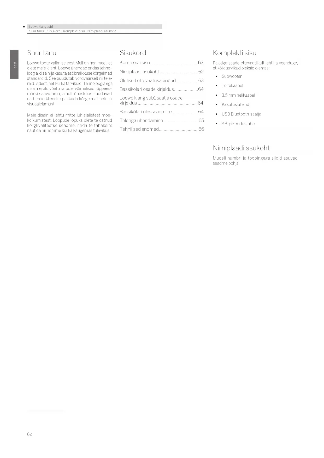 Loewe Technology GmbH deklareerib kaes- olevaga, et raadioseade, tuup Loewe klang subl. vastab direktiivi 2014/53/EL nouetele. EL-i vastavusdeklaratsiooni taistekt on saadaval jargmiselt voebiaadressilt: https://www.loewe.lv/de/support