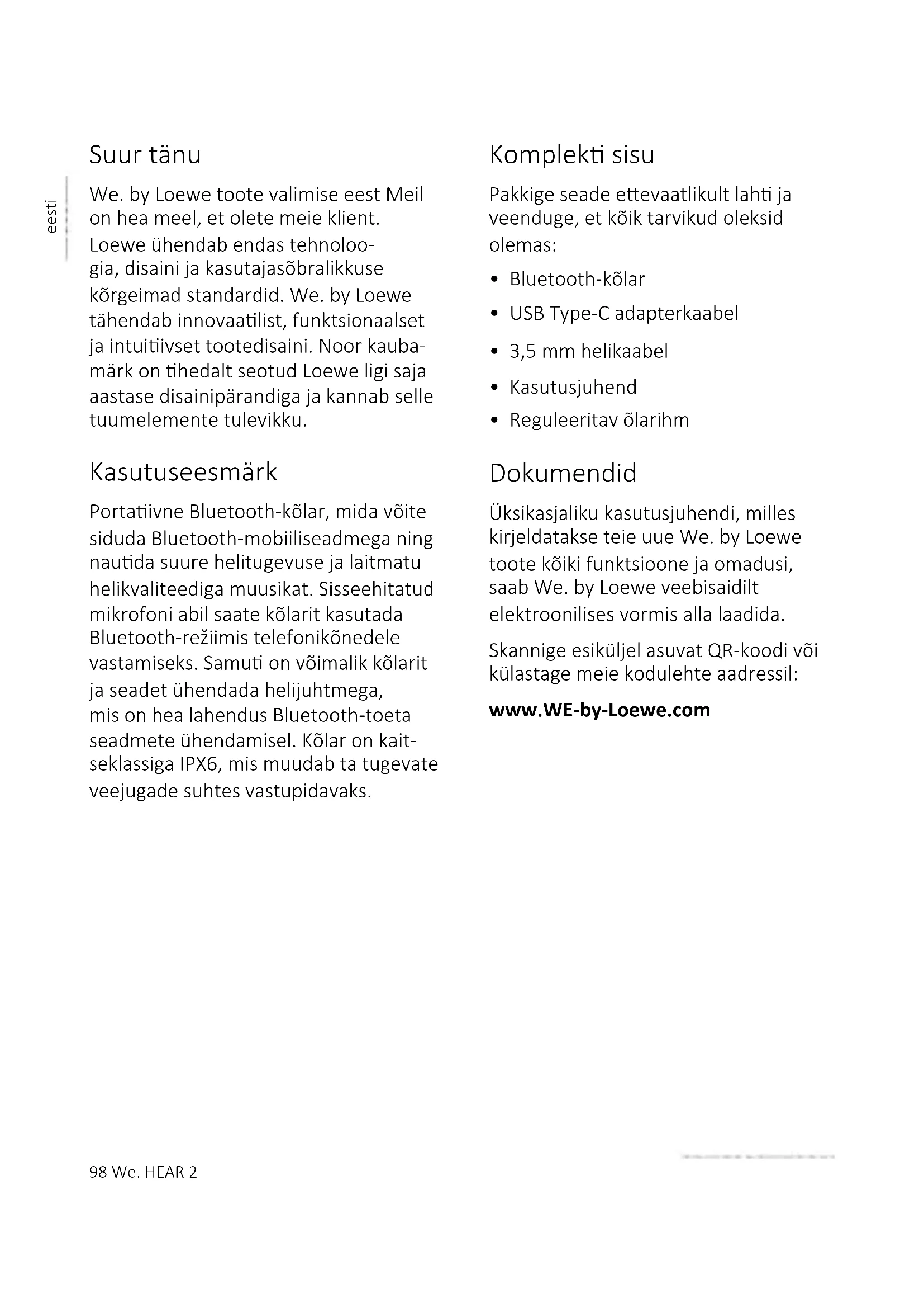 kustub. 9 Veekindlus IPX6 Selle seadme kaitseklass on IPX6, mis tähendab, et tugevad veejoad seadet ei kahjusta. Kaitse toimimiseks ei tohi kõlariga olla juhtmetega ühendatud välisseadmeid (näiteks telefon helikaabliga või laadija USB-kaabliga) ja piskusektsioon peab olema kindlalt suletud.104 We. HEAR 2 eesti Tõrkeotsing Seadme rikke korral soovitame teil enne klienditoele helistamist vaadata läbi järgnev loend. Probleem Võimalik põhjus Lahendus/märkused Kõlarit ei õnnestu sisse lülitada. Aku laetustase võib olla väga madal. Laadige kõlarit. Kõlari laadimine kestab väga kaua. Teie USB-laadija annab liiga vähe voolu. Kasutage 5 V / 2 A USB-laadijat. Kõlarist ei tule heli a. Helitugevus on liiga nõrk või vaigistatud. b. Kõlariga ei ole ühtegi seadet seotud. a. Vajutage mitu korda helitugevusnuppu (+) või suurendage oma seadme helitugevust. b. Siduge ja ühendage oma Bluetooth-seade. Heli on moonutatud a. Bluetooth-seade on kõlarist liiga kaugel b. Tegemist on raadioside segamisega a. Viige seade kõlarile lähemale b. Viige kõlar raadiosidesead- mest eemale. Tehnilised andmed We. by Loewe seadme tüüp: We. HEAR 2 Osa number: 60702x10 Aku tüüp: Sisseehitatud Li-ioon aku 7,4 V / 4000 mAh Laadimisvool: 5 V / 2 A Esitusaeg: 15 – 17 h Laadimisaeg: 4 – 5 h Kõlar 2x 15 W RMS Veekindlus IPX6 Bluetoothi versioon V5.0 Bluetoothi võimsus/sagedusvahemik: Suurim võimsus <10 mW sagedusel 2402–2480 MHz Bluetoothi protokollid: A2DP, AVRCP Seadme mõõtmed (L x K x S): 118 x 290 x 112 mm Seadme kaal: 2 kg Ümbritsev temperatuur: 0 °C – 40 °C Suhteline õhuniiskus (mitte kondenseeruv): 20–70%We. HEAR 2 105 eesti106 dansk We. HEAR 2 Tak, fordi du valgte et We. by Loewe produkt. Vi er glade for at have dig som kunde. Hos Loewe kombinerer vi de højeste standarder inden for teknologi, design og brugervenlighed. We. by Loewe står for innovavt, funkonelt og intuivt produktdesign. Dee unge mærke er tæt forbundet med Loewes næsten 100 år gamle designtradion og oversæer sine kerneelementer l fremden. Tilsigtet brug En bærbar Bluetooth-højaler, som du kan parre med en Bluetooth-mo- bilenhed og nyde musik ved højere lydstyrke og fremragende lydkvalitet. Den indbyggede mikrofon giver dig mulighed for at bruge højaleren l at besvare telefonopkald i Bluetooth-l- stand. Der er også mulighed for at slue højaleren l enheden med et lydkabel, som er nygt l lslutning af enheder uden Bluetooth-understøelse. Højt- taleren er IPX6-beskyet, hvilket gør den modstandsdygg over for kraige vandstråler. Leveringsomfang Pak forsiggt enheden ud, og sørg for, at alt lbehør er l stede: