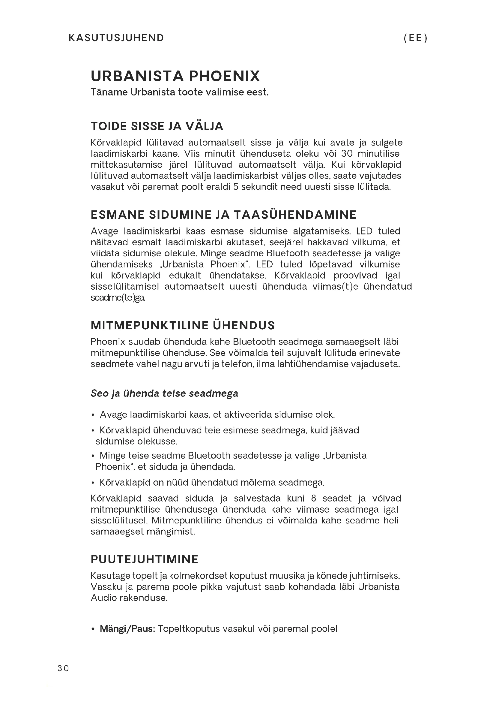 Avage laadimiskarbi kaas esmase sidumise algatamiseks. LED tuled näitavad esmalt laadimiskarbi akutaset, seejärel hakkavad vilkuma, et viidata sidumise olekule. Minge seadme Bluetooth seadetesse ja valige ühendamiseks „Urbanista Phoenix“. LED tuled lõpetavad vilkumise kui kõrvaklapid edukalt ühendatakse. Kõrvaklapid proovivad igal sisselülitamisel automaatselt uuesti ühenduda viimas(t)e ühendatud seadme(te)ga. MITMEPUNKTILINE ÜHENDUS Phoenix suudab ühenduda kahe Bluetooth seadmega samaaegselt läbi mitmepunktilise ühenduse. See võimalda teil sujuvalt lülituda erinevate seadmete vahel nagu arvuti ja telefon, ilma lahtiühendamise vajaduseta. Seo ja ühenda teise seadmega