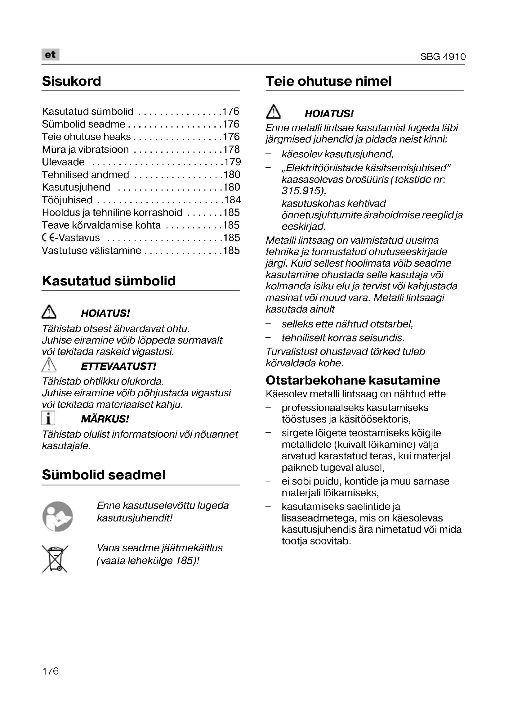 Kasutatud sümbolid HOIATUS! Tähistab otsest ähvardavat ohtu. Juhise eiramine võib lõppeda surmavalt või tekitada raskeid vigastusi. ETTEVAATUST! Tähistab ohtlikku olukorda. Juhise eiramine võib põhjustada vigastusi või tekitada materiaalset kahju. MÄRKUS! Tähistab olulist informatsiooni või nõuannet kasutajale. Sümbolid seadmel Enne kasutuselevõttu lugeda kasutusjuhendit! Vana seadme jäätmekäitlus (vaata lehekülge 185)! Teie ohutuse nimel HOIATUS! Enne metalli lintsae kasutamist lugeda läbi järgmised juhendid ja pidada neist kinni: