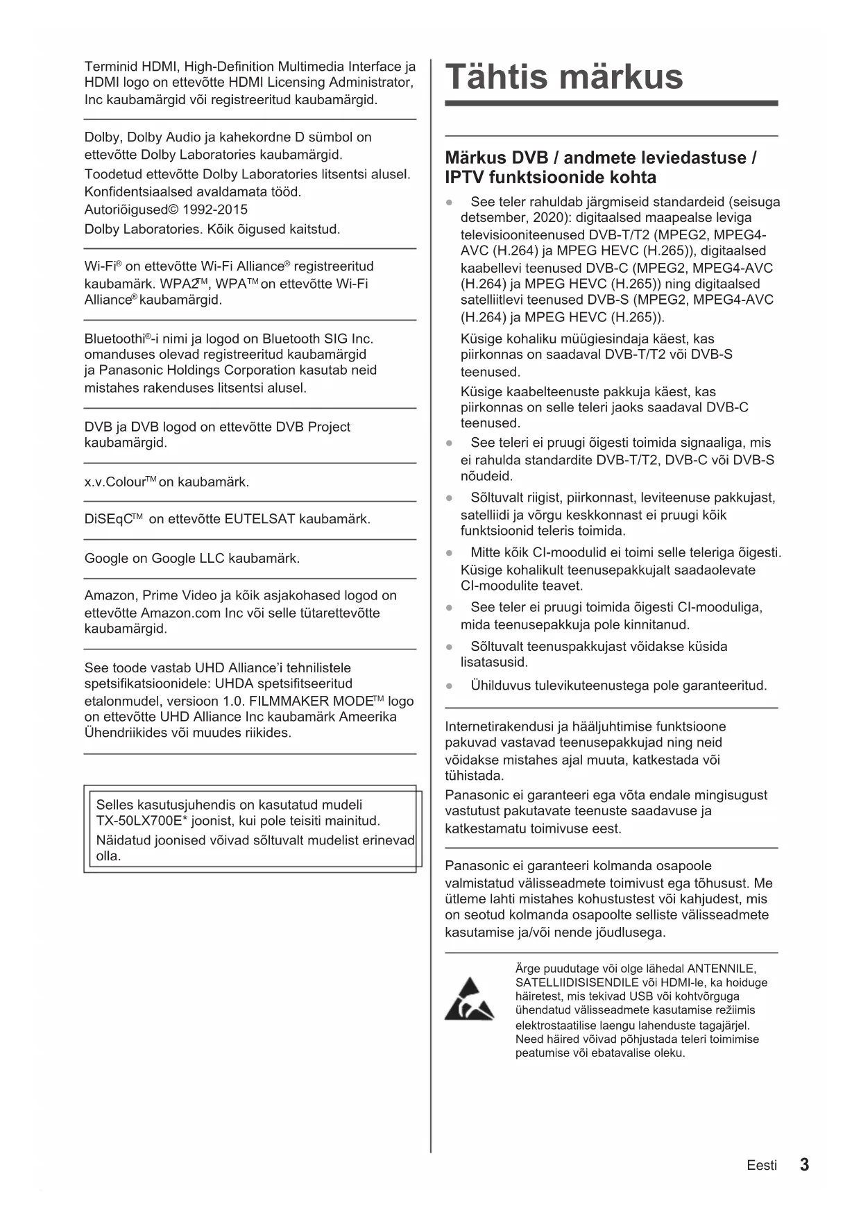 logo on ettevõtte UHD Alliance Inc kaubamärk Ameerika Ühendriikides või muudes riikides. Selles kasutusjuhendis on kasutatud mudeli TX-50LX700E* joonist, kui pole teisiti mainitud. Näidatud joonised võivad sõltuvalt mudelist erinevad olla. Tähtis märkus Märkus DVB / andmete leviedastuse / IPTV funktsioonide kohta ● See teler rahuldab järgmiseid standardeid (seisuga detsember, 2020): digitaalsed maapealse leviga televisiooniteenused DVB-T/T2 (MPEG2, MPEG4- AVC (H.264) ja MPEG HEVC (H.265)), digitaalsed kaabellevi teenused DVB-C (MPEG2, MPEG4-AVC (H.264) ja MPEG HEVC (H.265)) ning digitaalsed satelliitlevi teenused DVB-S (MPEG2, MPEG4-AVC (H.264) ja MPEG HEVC (H.265)). Küsige kohaliku müügiesindaja käest, kas piirkonnas on saadaval DVB-T/T2 või DVB-S teenused. Küsige kaabelteenuste pakkuja käest, kas piirkonnas on selle teleri jaoks saadaval DVB-C teenused. ● See teleri ei pruugi õigesti toimida signaaliga, mis ei rahulda standardite DVB-T/T2, DVB-C või DVB-S nõudeid. ● Sõltuvalt riigist, piirkonnast, leviteenuse pakkujast, satelliidi ja võrgu keskkonnast ei pruugi kõik funktsioonid teleris toimida. ● Mitte kõik CI-moodulid ei toimi selle teleriga õigesti. Küsige kohalikult teenusepakkujalt saadaolevate CI-moodulite teavet. ● See teler ei pruugi toimida õigesti CI-mooduliga, mida teenusepakkuja pole kinnitanud. ● Sõltuvalt teenuspakkujast võidakse küsida lisatasusid. ● Ühilduvus tulevikuteenustega pole garanteeritud. Internetirakendusi ja hääljuhtimise funktsioone pakuvad vastavad teenusepakkujad ning neid võidakse mistahes ajal muuta, katkestada või tühistada. Panasonic ei garanteeri ega võta endale mingisugust vastutust pakutavate teenuste saadavuse ja katkestamatu toimivuse eest. Panasonic ei garanteeri kolmanda osapoole valmistatud välisseadmete toimivust ega tõhusust. Me ütleme lahti mistahes kohustustest või kahjudest, mis on seotud kolmanda osapoolte selliste välisseadmete kasutamise ja/või nende jõudlusega. Ärge puudutage või olge lähedal ANTENNILE, SATELLIIDISISENDILE või HDMI-le, ka hoiduge häiretest, mis tekivad USB või kohtvõrguga ühendatudvälisseadmetekasutamiserežiimis elektrostaatilise laengu lahenduste tagajärjel. Need häired võivad põhjustada teleri toimimise peatumise või ebatavalise oleku.Eesti