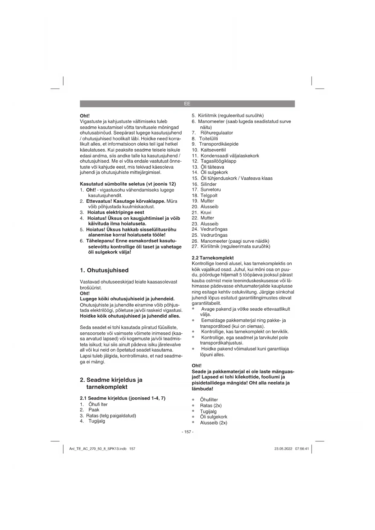 Märkus! Kondensvesi tuleb iga päev vee-eemal- dusventiili (11) (paagi põhja all) kaudu välja lasta. Kontrollige enne iga kasutamist, ega survepaagil pole roostet või kahjustusi. Kompressorit ei tohi käitada kahjustatud või roostes survepaagiga. Kui avastate kahjustuse, pöörduge klienditeenindus- töökotta. Märkus! Paagi kondensvesi sisaldab õlijääke. Viige kondensvesi keskkonnateadlikult vastavasse kogumiskohta. Anl_TE_AC_270_50_8_SPK13.indb 159Anl_TE_AC_270_50_8_SPK13.indb 159 23.05.2022 07:56:4123.05.2022 07:56:41EE