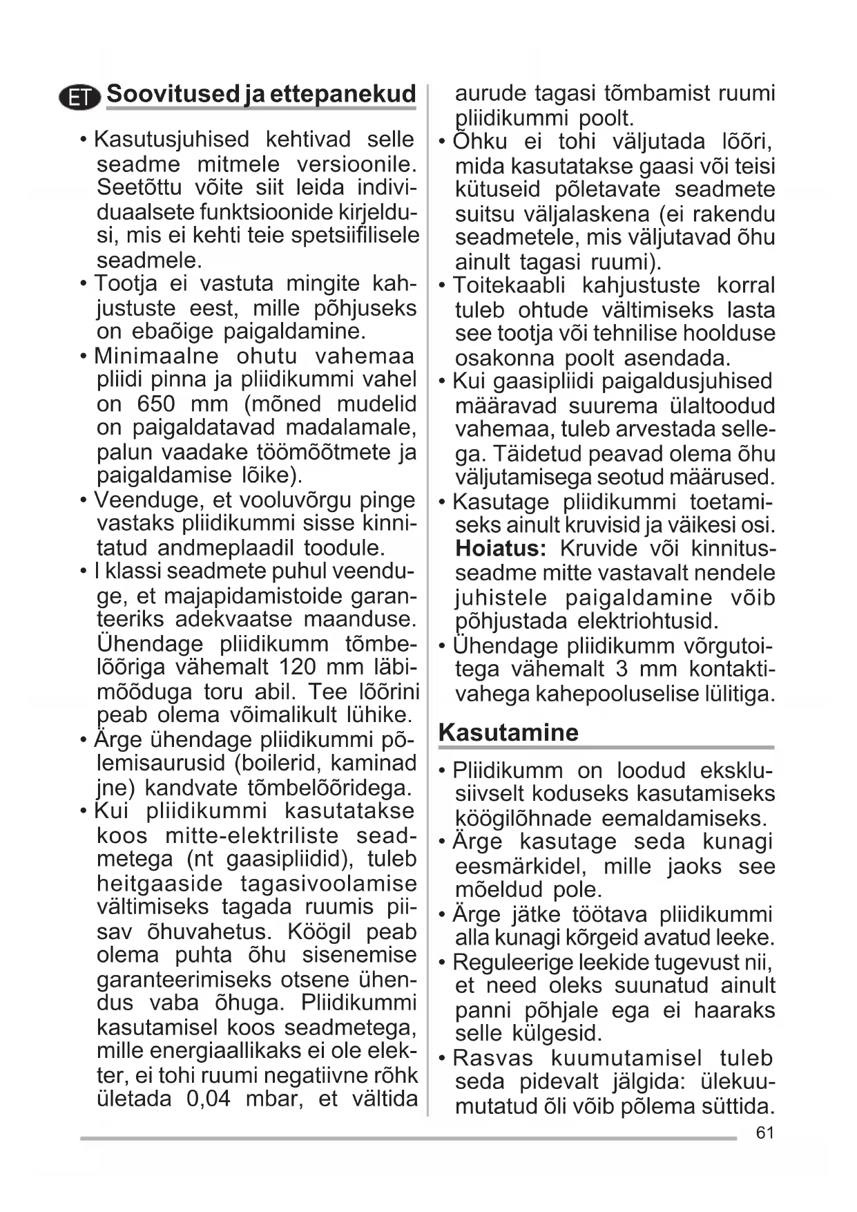 - Õhku ei tohi väljutada lõõri, mida kasutatakse gaasi või teisi kütuseid põletavate seadmete suitsu väljalaskena (ei rakendu seadmetele, mis väljutavad õhu ainult tagasi ruumi).