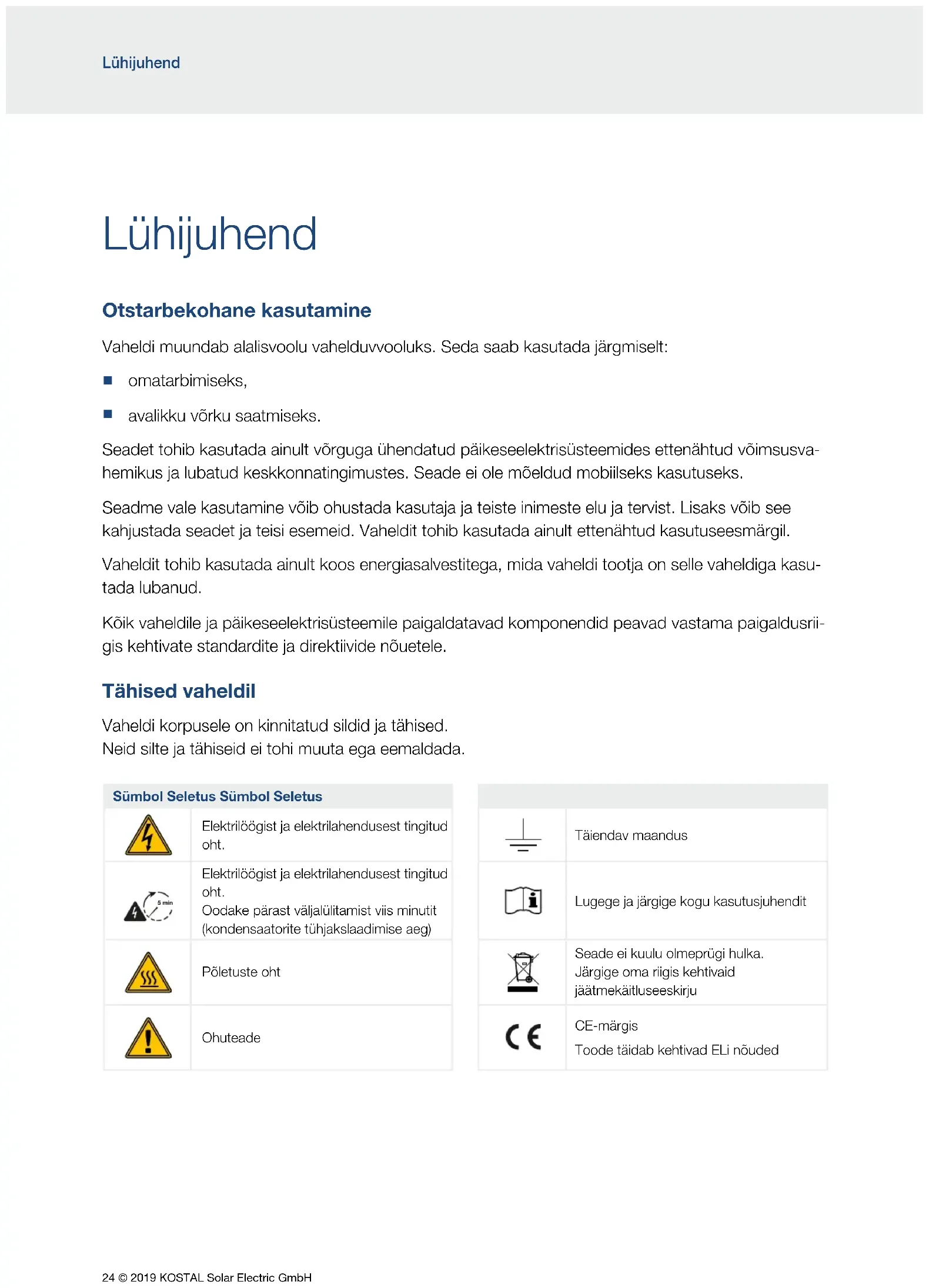 avalikku võrku saatmiseks. Seadet tohib kasutada ainult võrguga ühendatud päikeseelektrisüsteemides ettenähtud võimsusva- hemikus ja lubatud keskkonnatingimustes. Seade ei ole mõeldud mobiilseks kasutuseks. Seadme vale kasutamine võib ohustada kasutaja ja teiste inimeste elu ja tervist. Lisaks võib see kahjustada seadet ja teisi esemeid. Vaheldit tohib kasutada ainult ettenähtud kasutuseesmärgil. Vaheldit tohib kasutada ainult koos energiasalvestitega, mida vaheldi tootja on selle vaheldiga kasu- tada lubanud. Kõik vaheldile ja päikeseelektrisüsteemile paigaldatavad komponendid peavad vastama paigaldusrii- gis kehtivate standardite ja direktiivide nõuetele. Tähised vaheldil Vaheldi korpusele on kinnitatud sildid ja tähised. Neid silte ja tähiseid ei tohi muuta ega eemaldada. Sümbol Seletus Sümbol Seletus Elektrilöögist ja elektrilahendusest tingitud oht. Täiendav maandus 5 min Elektrilöögist ja elektrilahendusest tingitud oht. Oodake pärast väljalülitamist viis minutit (kondensaatorite tühjakslaadimise aeg) Lugege ja järgige kogu kasutusjuhendit 5 min Põletuste oht Seade ei kuulu olmeprügi hulka. Järgige oma riigis kehtivaid jäätmekäitluseeskirju Ohuteade CE-märgis Toode täidab kehtivad ELi nõuded© 2019 KOSTAL Solar Electric GmbH 25