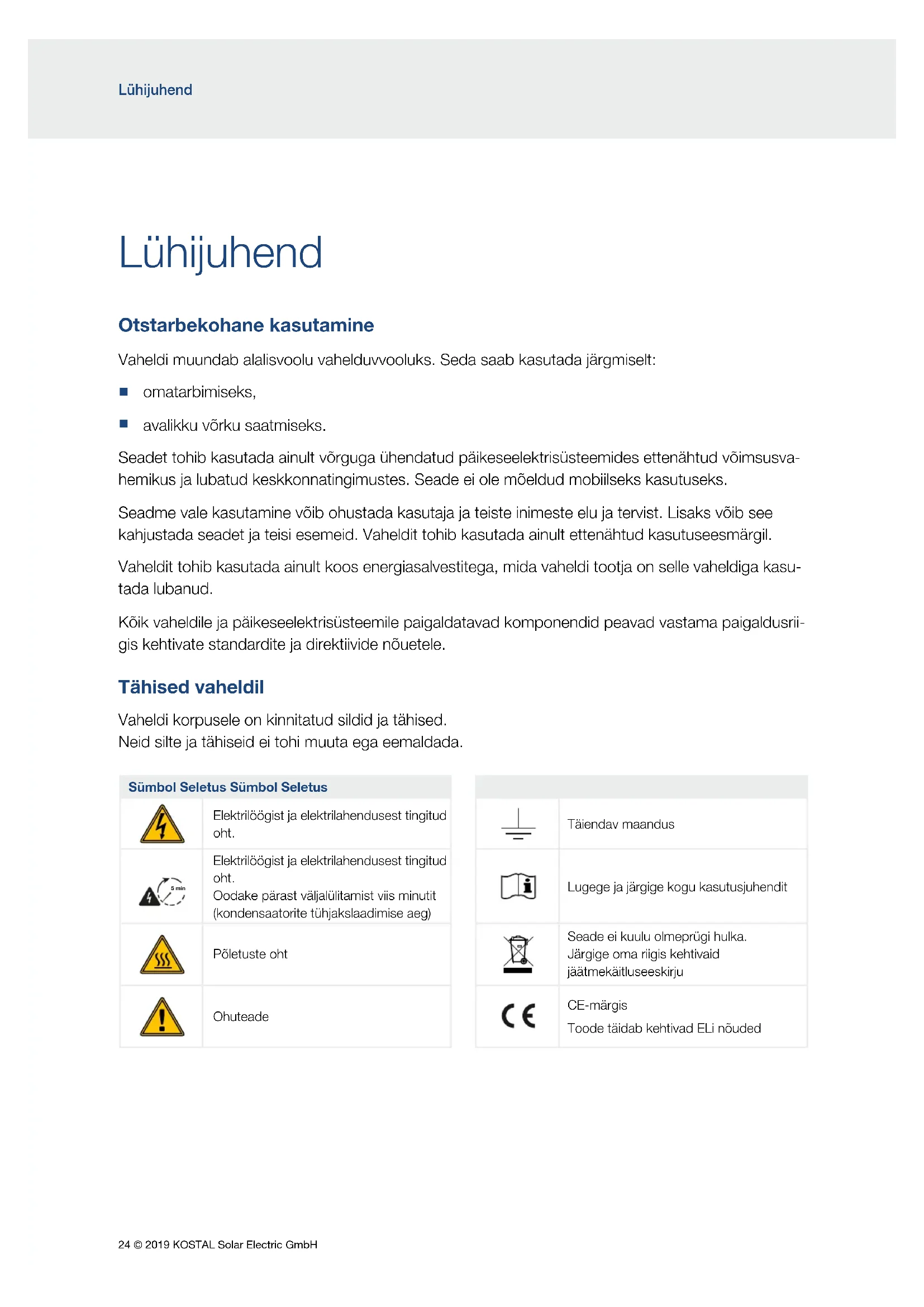 avalikku võrku saatmiseks. Seadet tohib kasutada ainult võrguga ühendatud päikeseelektrisüsteemides ettenähtud võimsusva- hemikus ja lubatud keskkonnatingimustes. Seade ei ole mõeldud mobiilseks kasutuseks. Seadme vale kasutamine võib ohustada kasutaja ja teiste inimeste elu ja tervist. Lisaks võib see kahjustada seadet ja teisi esemeid. Vaheldit tohib kasutada ainult ettenähtud kasutuseesmärgil. Vaheldit tohib kasutada ainult koos energiasalvestitega, mida vaheldi tootja on selle vaheldiga kasu- tada lubanud. Kõik vaheldile ja päikeseelektrisüsteemile paigaldatavad komponendid peavad vastama paigaldusrii- gis kehtivate standardite ja direktiivide nõuetele. Tähised vaheldil Vaheldi korpusele on kinnitatud sildid ja tähised. Neid silte ja tähiseid ei tohi muuta ega eemaldada. Sümbol Seletus Sümbol Seletus Elektrilöögist ja elektrilahendusest tingitud oht. Täiendav maandus 5 min Elektrilöögist ja elektrilahendusest tingitud oht. Oodake pärast väljalülitamist viis minutit (kondensaatorite tühjakslaadimise aeg) Lugege ja järgige kogu kasutusjuhendit 5 min Põletuste oht Seade ei kuulu olmeprügi hulka. Järgige oma riigis kehtivaid jäätmekäitluseeskirju Ohuteade CE-märgis Toode täidab kehtivad ELi nõuded© 2019 KOSTAL Solar Electric GmbH 25