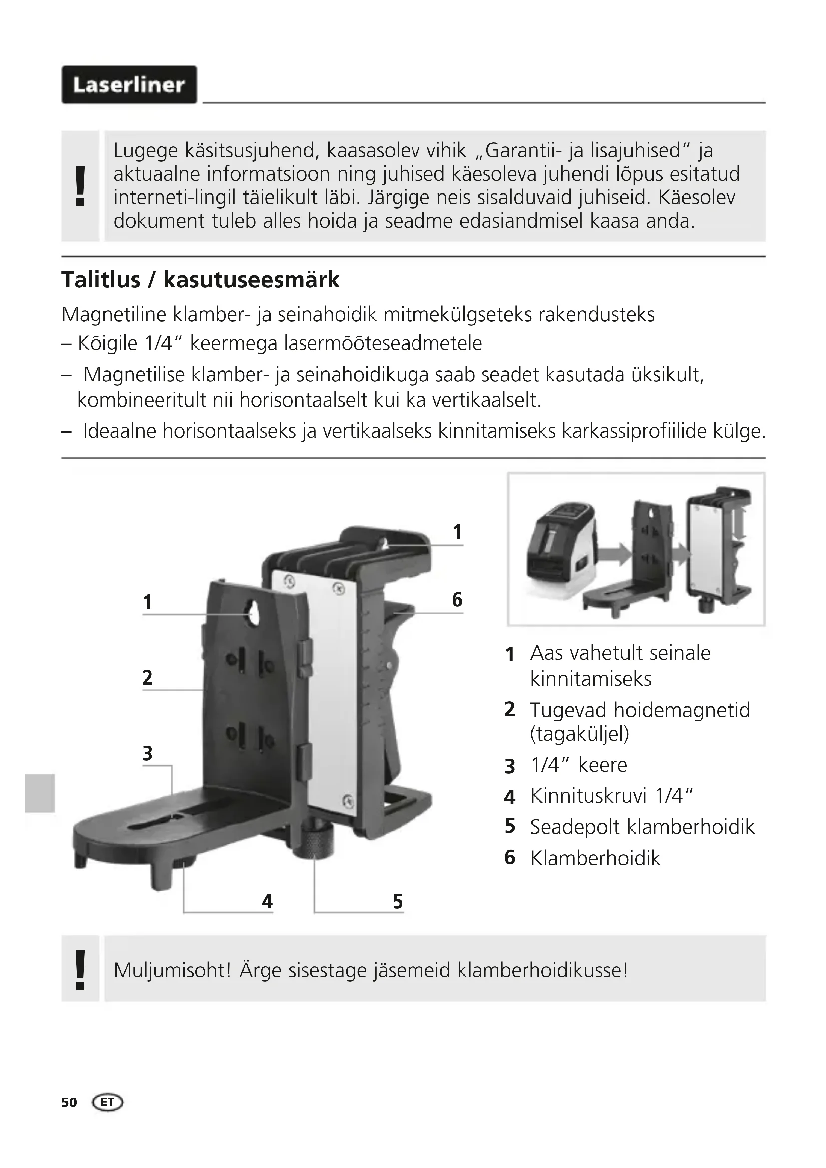 Talitlus / kasutuseesmärk Magnetiline klamber- ja seinahoidik mitmekülgseteks rakendusteks – Kõigile 1/4“ keermega lasermõõteseadmetele – Magnetilise klamber- ja seinahoidikuga saab seadet kasutada üksikult, kombineeritult nii horisontaalselt kui ka vertikaalselt. – Ideaalne horisontaalseks ja vertikaalseks kinnitamiseks karkassiproilide külge. Lugege käsitsusjuhend, kaasasolev vihik „Garantii- ja lisajuhised“ ja aktuaalne informatsioon ning juhised käesoleva juhendi lõpus esitatud interneti-lingil täielikult läbi. Järgige neis sisalduvaid juhiseid. Käesolev dokument tuleb alles hoida ja seadme edasiandmisel kaasa anda.
