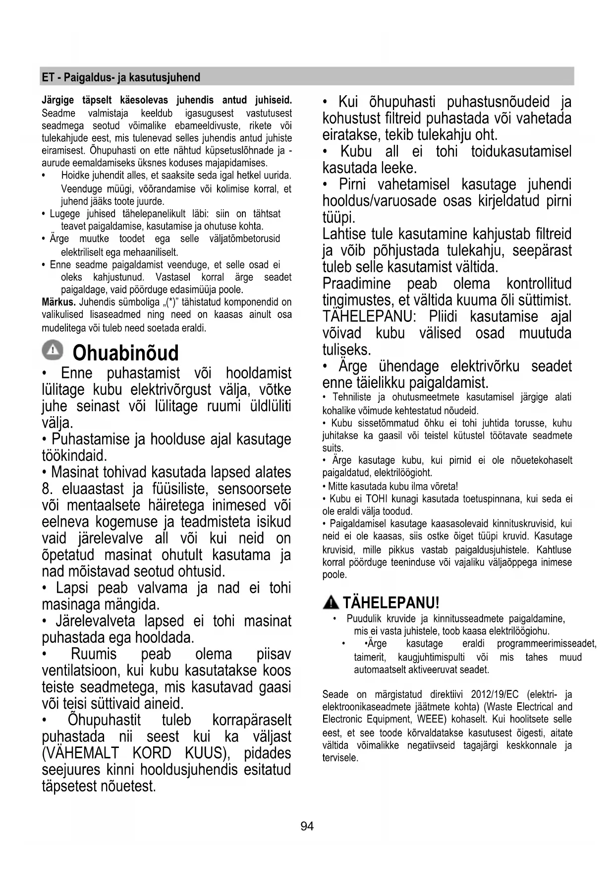 - Kui õhupuhasti puhastusnõudeid ja kohustust filtreid puhastada või vahetada eiratakse, tekib tulekahju oht.