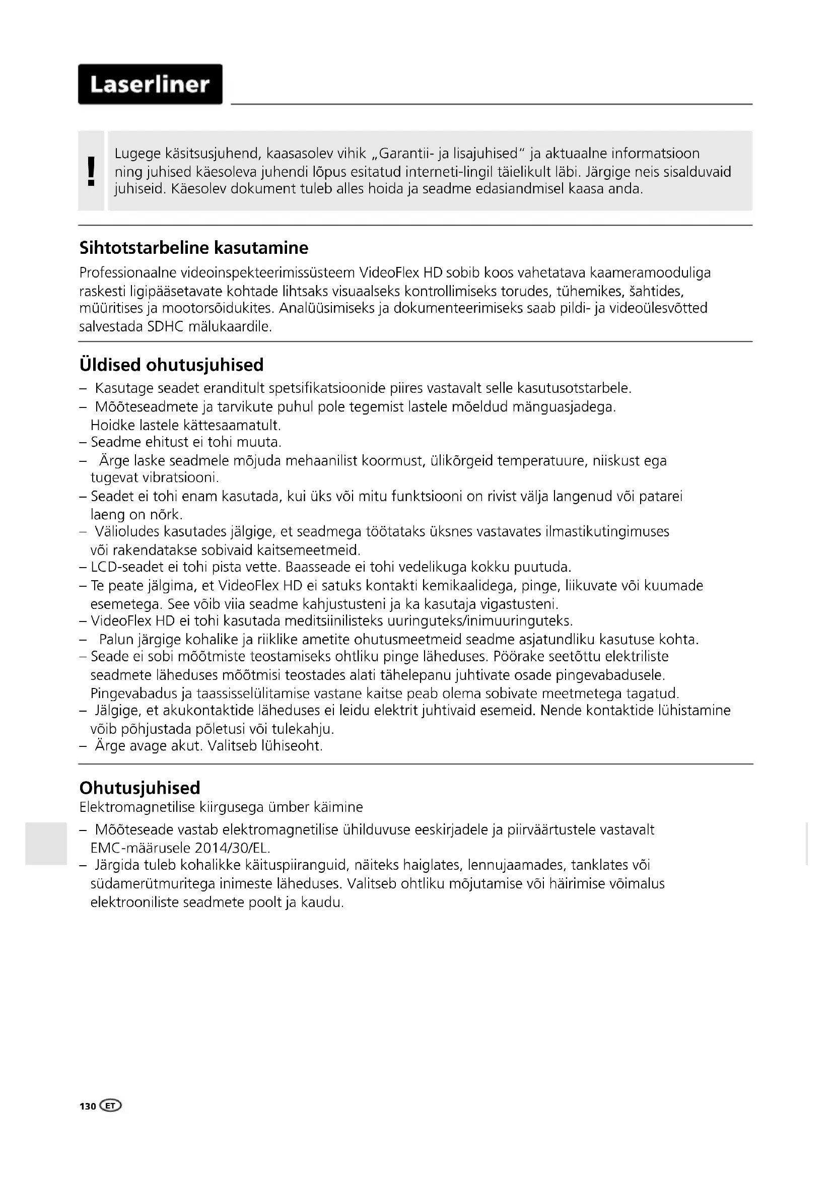 CSOhutusjuhised Elektromagnetilise kiirgusega ümber käimine – Mõõteseade vastab elektromagnetilise ühilduvuse eeskirjadele ja piirväärtustele vastavalt EMC-määrusele 2014/30/EL. – Järgida tuleb kohalikke käituspiiranguid, näiteks haiglates, lennujaamades, tanklates või südamerütmuritega inimeste läheduses. Valitseb ohtliku mõjutamise või häirimise võimalus elektrooniliste seadmete poolt ja kaudu. Üldised ohutusjuhised – Kasutage seadet eranditult spetsikatsioonide piires vastavalt selle kasutusotstarbele. – Mõõteseadmete ja tarvikute puhul pole tegemist lastele mõeldud mänguasjadega. Hoidke lastele kättesaamatult. – Seadme ehitust ei tohi muuta. – Ärge laske seadmele mõjuda mehaanilist koormust, ülikõrgeid temperatuure, niiskust ega tugevat vibratsiooni. – Seadet ei tohi enam kasutada, kui üks või mitu funktsiooni on rivist välja langenud või patarei laeng on nõrk. – Välioludes kasutades jälgige, et seadmega töötataks üksnes vastavates ilmastikutingimuses või rakendatakse sobivaid kaitsemeetmeid. – LCD-seadet ei tohi pista vette. Baasseade ei tohi vedelikuga kokku puutuda. – Te peate jälgima, et VideoFlex HD ei satuks kontakti kemikaalidega, pinge, liikuvate või kuumade esemetega. See võib viia seadme kahjustusteni ja ka kasutaja vigastusteni. – VideoFlex HD ei tohi kasutada meditsiinilisteks uuringuteks/inimuuringuteks. – Palun järgige kohalike ja riiklike ametite ohutusmeetmeid seadme asjatundliku kasutuse kohta. – Seade ei sobi mõõtmiste teostamiseks ohtliku pinge läheduses. Pöörake seetõttu elektriliste seadmete läheduses mõõtmisi teostades alati tähelepanu juhtivate osade pingevabadusele. Pingevabadus ja taassisselülitamise vastane kaitse peab olema sobivate meetmetega tagatud. – Jälgige, et akukontaktide läheduses ei leidu elektrit juhtivaid esemeid. Nende kontaktide lühistamine võib põhjustada põletusi või tulekahju. – Ärge avage akut. Valitseb lühiseoht. Sihtotstarbeline kasutamine Professionaalne videoinspekteerimissüsteem VideoFlex HD sobib koos vahetatava kaameramooduliga raskesti ligipääsetavate kohtade lihtsaks visuaalseks kontrollimiseks torudes, tühemikes, šahtides, müüritises ja mootorsõidukites. Analüüsimiseks ja dokumenteerimiseks saab pildi- ja videoülesvõtted salvestada SDHC mälukaardile. Lugege käsitsusjuhend, kaasasolev vihik „Garantii- ja lisajuhised“ ja aktuaalne informatsioon ning juhised käesoleva juhendi lõpus esitatud interneti-lingil täielikult läbi. Järgige neis sisalduvaid juhiseid. Käesolev dokument tuleb alles hoida ja seadme edasiandmisel kaasa anda.