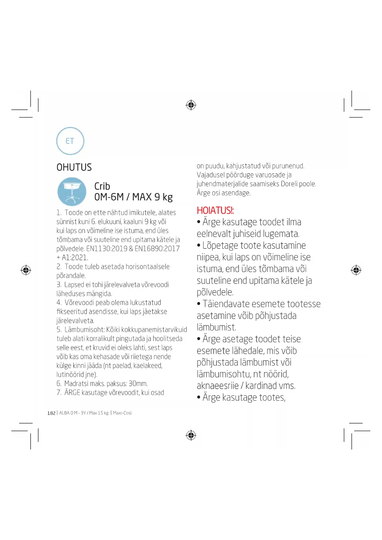 sünnist kuni 6. elukuuni, kaaluni 9 kg või kui laps on võimeline ise istuma, end üles tõmbama või suuteline end upitama kätele ja põlvedele. EN1130:2019 & EN16890:2017 + A1:2021.
