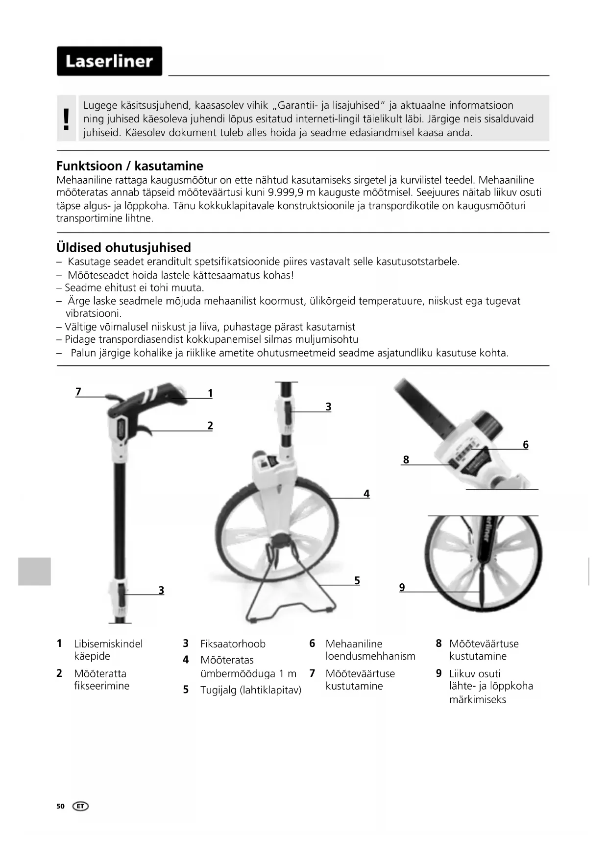 Funktsioon / kasutamine Mehaaniline rattaga kaugusmõõtur on ette nähtud kasutamiseks sirgetel ja kurvilistel teedel. Mehaaniline mõõteratas annab täpseid mõõteväärtusi kuni 9.999,9 m kauguste mõõtmisel. Seejuures näitab liikuv osuti täpse algus- ja lõppkoha. Tänu kokkuklapitavale konstruktsioonile ja transpordikotile on kaugusmõõturi transportimine lihtne. Üldised ohutusjuhised – Kasutage seadet eranditult spetsikatsioonide piires vastavalt selle kasutusotstarbele. – Mõõteseadet hoida lastele kättesaamatus kohas! – Seadme ehitust ei tohi muuta. – Ärge laske seadmele mõjuda mehaanilist koormust, ülikõrgeid temperatuure, niiskust ega tugevat vibratsiooni. – Vältige võimalusel niiskust ja liiva, puhastage pärast kasutamist – Pidage transpordiasendist kokkupanemisel silmas muljumisohtu – Palun järgige kohalike ja riiklike ametite ohutusmeetmeid seadme asjatundliku kasutuse kohta.