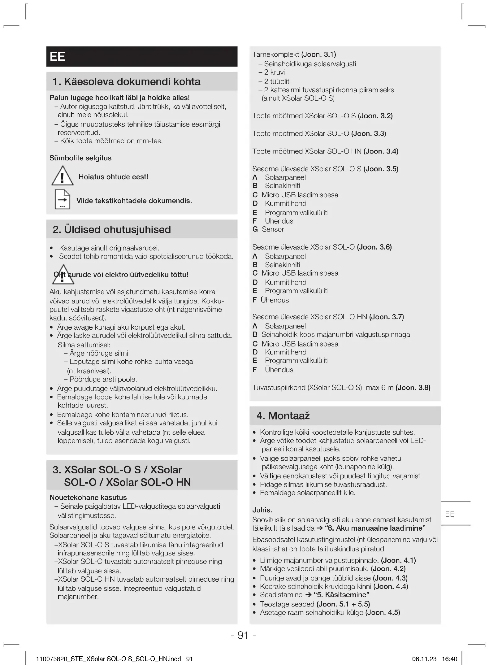 - Puhastage solaarpaneel pehme lapi ja pehmetoimelise puhastusvahendiga. 8 Utiliseerimine Elektriseadmed, lisatarvikud ja pakendid tuleb suunata keskkonnateadlikku taaskasutusse. Ärge visake elektriseadmeid olmejäätmete hulka! Ainult ELi riikidele Vastavalt vanu elektri- ja elektroonikaseadmeid puudutavale kehtivale Euroopa määrusele ja selle rakendamisele rahvusva- helises õiguses tuleb kasutuskõlbmatud elektriseadmed koguda eraldi ning suunata keskkonnateadlikku taaskasutusse. 110073820_STE_XSolar SOL-O S_SOL-O_HN.indd 92110073820_STE_XSolar SOL-O S_SOL-O_HN.indd 92 06.11.23 16:4006.11.23 16:40- 93 - Ärge visake vanu seadmeid, akusid/patareisid majapidamisprügisse, tulle ega vette. Akud/patareid tuleks kokku koguda, taaskäidelda või keskkonnasõbralikul viisil utiliseerida.Ainult ELi riikideleDirektiivi 2006/66/EÜ kohaselt tuleb defektsed või kasutatud akud/patareid taaskäidelda. Kasutuskõlbmatuks muutunud akud/patareid saab müügipunktis või saasteainete kogumispunktis ära anda.9 Tootja garantiiTootja garantii STEINEL GmbH, Dieselstraße 80-84, DE-33442 Herzebrock-Clarholz, SaksamaaSteineli toode on valmistatud suurima hoolikusega, on talitluslikult ja ohutusalaselt kehtivate eeskirjade alusel kontrollitud ning seejärel läbinud pistelise kontrolli.Steinel annab garantii toote laitmatu kvaliteedi ja töökorras oleku kohta. Garantiiaeg on 36kuud ja see algab tarbijale toote ostmise päevast. Meie remondime materjalist või tootmisvigadest tulenevad puudused, garantiijuhtumi korral seade kas remonditakse või puudulik osa asendatakse uuega, valiku üle otsustame meie. Garantii ei kehti kuluvate osade ning kahju ja puuduste kohta, mis on tekkinud oskamatu käsitsemise või hoolduse tagajärjel. Edasised võõresemetele põhjustatud järgkahjud on välistatud.Garantiinõuet aktsepteeritakse ainult siis, kui osandamata seade saadetakse koos vea lühikirjelduse, kassatšeki või arvega (ostukuupäev ja müüja tempel) ja korralikult pakituna vastavasse teeninduspunkti. Remonditeenus: Pärast garantiiaja lõppu või puuduste korral, millele garantii ei kehti, küsige parandamisvõimaluste kohta lähimast teenindusjaamast järele. 10 Tehnilised andmedSolaarvalgusti tehnilised andmed XSolarSOL-OS XSolarSOL-O XSolarSOL-OHNMõõtmed (L×K×Smm-tes) 242×53×91 242×38×91 242×183×91Võimsus max 3,3W max 0,1W max 0,1WTuvastusnurk 360° - -Tuvastusraadius max 6m - -Hämarusnivoo seadistamine 2lx Aja seadmine 10 – 30sautomaatselt - - Öövalgustus 3% - - Valgusvoog max 273lm max7,5lm max 7,5lm Tõhusus 83lm/W 75lm/W 75lm/WVärvitemperatuur 3.000KLEDi eluiga 50.000hKaitseliik IP44Kaitseklass IIITemperatuurivahemik -20°Ckuni+40°CAku tehnilised andmed XSolarSOL-OS XSolarSOL-O XSolarSOL-OHNTüüp Liitium-raudfosfaat (LiFePO4)Mahtuvus 2×2.000mAH 2.000mAH 2.000mAHMax kasutusiga 20päeva20 lülituse korral öö kohtaMicro USB laadimispesa 5V,max1A TOOTJA