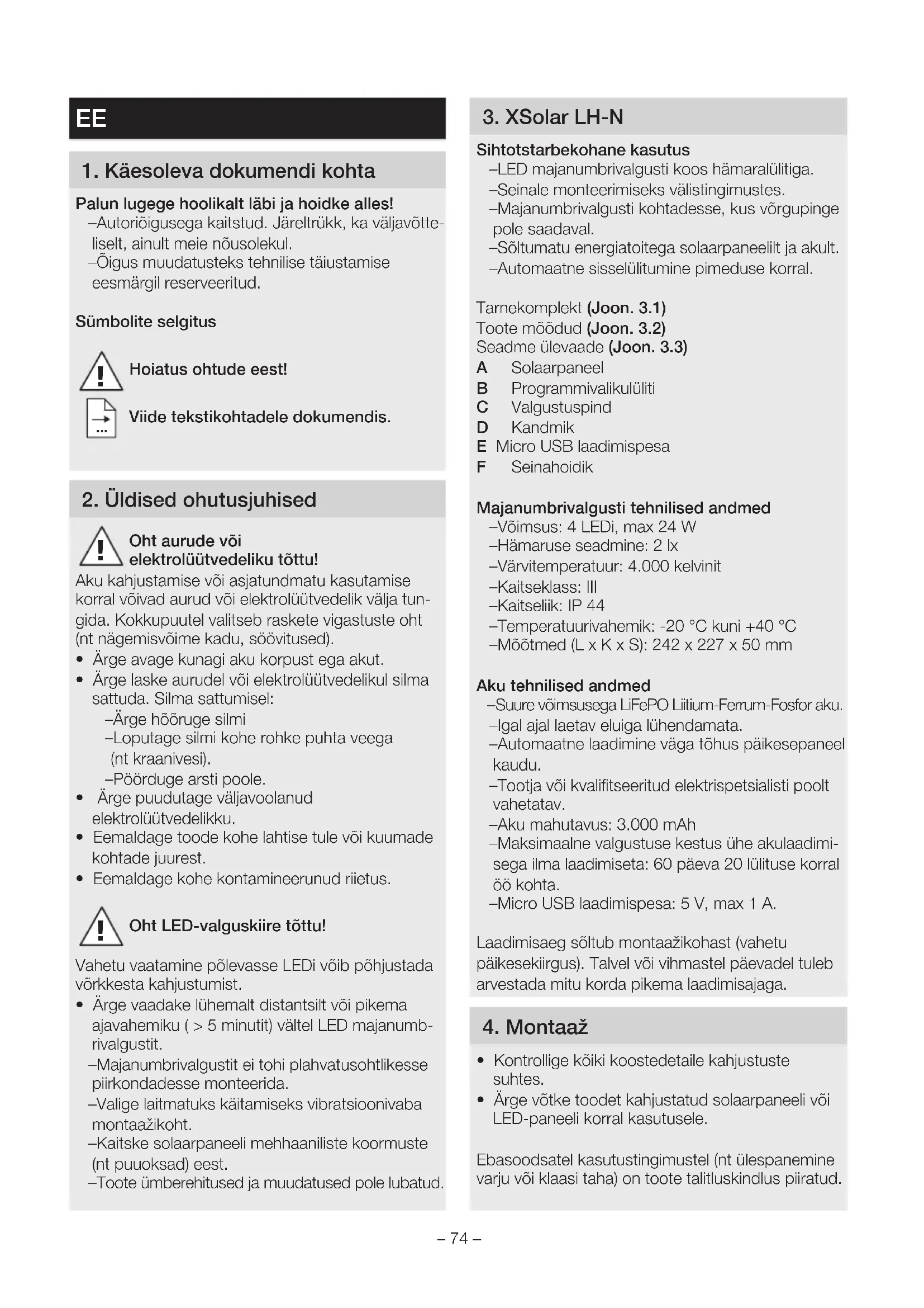 - Ärge vaadake lühemalt distantsilt või pikema ajavahemiku ( > 5 minutit) vältel LED majanumb- rivalgustit. – Majanumbrivalgustit ei tohi plahvatusohtlikesse piirkondadesse monteerida. – Valige laitmatuks käitamiseks vibratsioonivaba montaažikoht. – Kaitske solaarpaneeli mehhaaniliste koormuste (nt puuoksad) eest. – Toote ümberehitused ja muudatused pole lubatud. 3 XSolar LH-N Sihtotstarbekohane kasutus – LED majanumbrivalgusti koos hämaralülitiga. – Seinale monteerimiseks välistingimustes. – Majanumbrivalgusti kohtadesse, kus võrgupinge pole saadaval. – Sõltumatu energiatoitega solaarpaneelilt ja akult. – Automaatne sisselülitumine pimeduse korral. Tarnekomplekt (Joon 31) Toote mõõdud (Joon 32) Seadme ülevaade (Joon 33) A Solaarpaneel B Programmivalikulüliti C Valgustuspind D Kandmik E Micro USB laadimispesa F Seinahoidik Majanumbrivalgusti tehnilised andmed – Võimsus: 4 LEDi, max 24 W – Hämaruse seadmine: 2 lx – Värvitemperatuur: 4.000 kelvinit – Kaitseklass: III – Kaitseliik: IP 44 – Temperatuurivahemik: -20 °C kuni +40 °C – Mõõtmed (LxKxS): 242 x 227 x 50 mm Aku tehnilised andmed – Suure võimsusega LiFePO Liitium-Ferrum-Fosfor aku. – Igal ajal laetav eluiga lühendamata. – Automaatne laadimine väga tõhus päikesepaneel kaudu. – Tootja või kvalifitseeritud elektrispetsialisti poolt vahetatav. – Aku mahutavus: 3.000mAh – Maksimaalne valgustuse kestus ühe akulaadimi- sega ilma laadimiseta: 60 päeva 20 lülituse korral öö kohta. – Micro USB laadimispesa: 5 V, max 1 A. Laadimisaeg sõltub montaažikohast (vahetu päikesekiirgus). Talvel või vihmastel päevadel tuleb arvestada mitu korda pikema laadimisajaga. 4 Montaaž