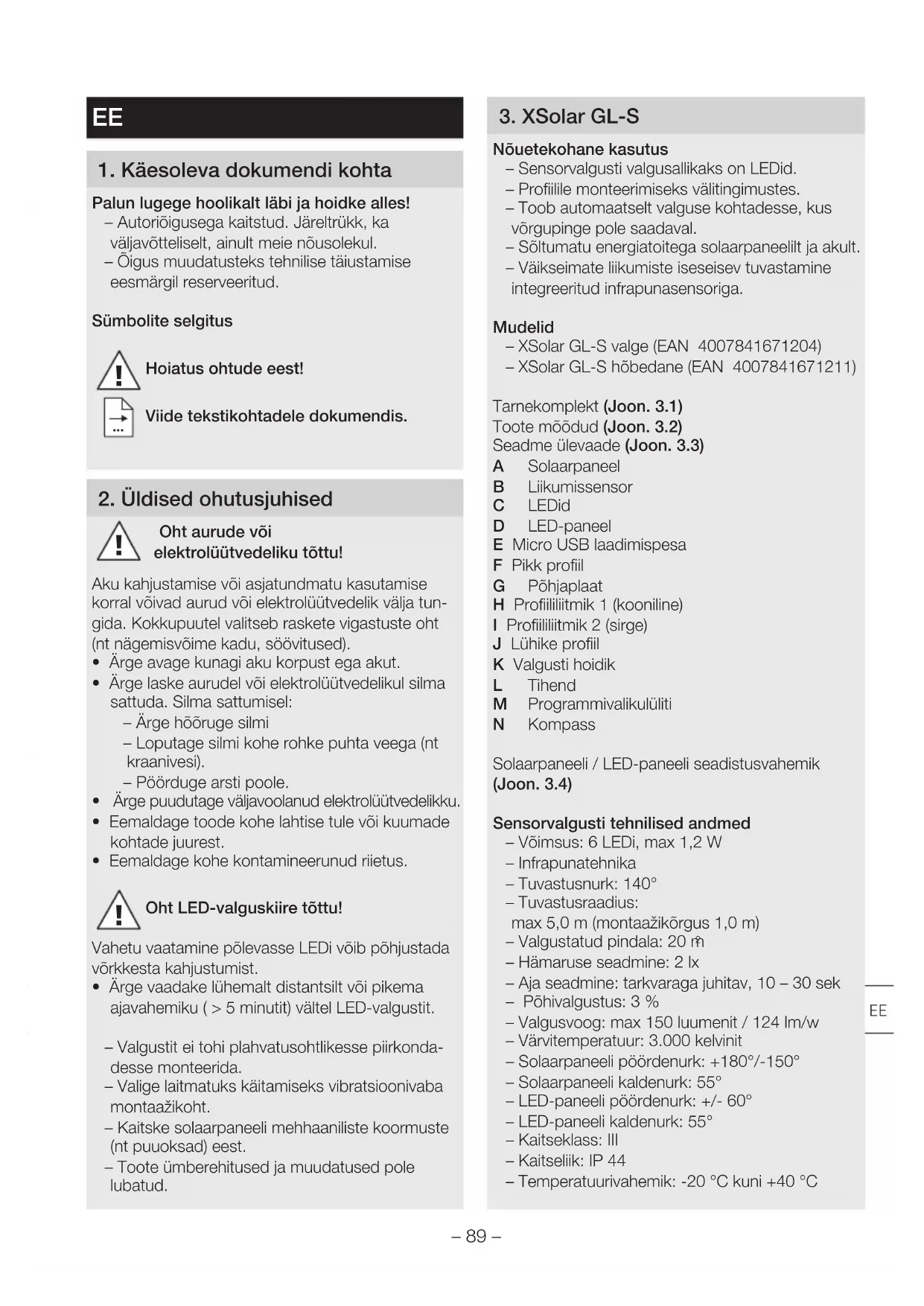 Nõuetekohane kasutus – Sensorvalgusti valgusallikaks on LEDid. – Profiilile monteerimiseks välitingimustes. – Toob automaatselt valguse kohtadesse, kus võrgupinge pole saadaval. – Sõltumatu energiatoitega solaarpaneelilt ja akult. – Väikseimate liikumiste iseseisev tuvastamine integreeritud infrapunasensoriga. Mudelid – XSolar GL-S valge (EAN 4007841671204) – XSolar GL-S hõbedane (EAN 4007841671211) Tarnekomplekt (Joon. 3.1) Toote mõõdud (Joon. 3.2) Seadme ülevaade (Joon. 3.3) A Solaarpaneel B Liikumissensor C LEDid D LED-paneel E Micro USB laadimispesa F Pikk profiil G Põhjaplaat H Profiililiitmik 1 (kooniline) I Profiililiitmik 2 (sirge) J Lühike profiil K Valgusti hoidik L Tihend M Programmivalikulüliti N Kompass Solaarpaneeli/LED-paneeli seadistusvahemik (Joon. 3.4) Sensorvalgusti tehnilised andmed – Võimsus: 6 LEDi, max 1,2 W – Infrapunatehnika – Tuvastusnurk: 140° – Tuvastusraadius: max 5,0 m (montaažikõrgus 1,0 m) – Valgustatud pindala: 20 m