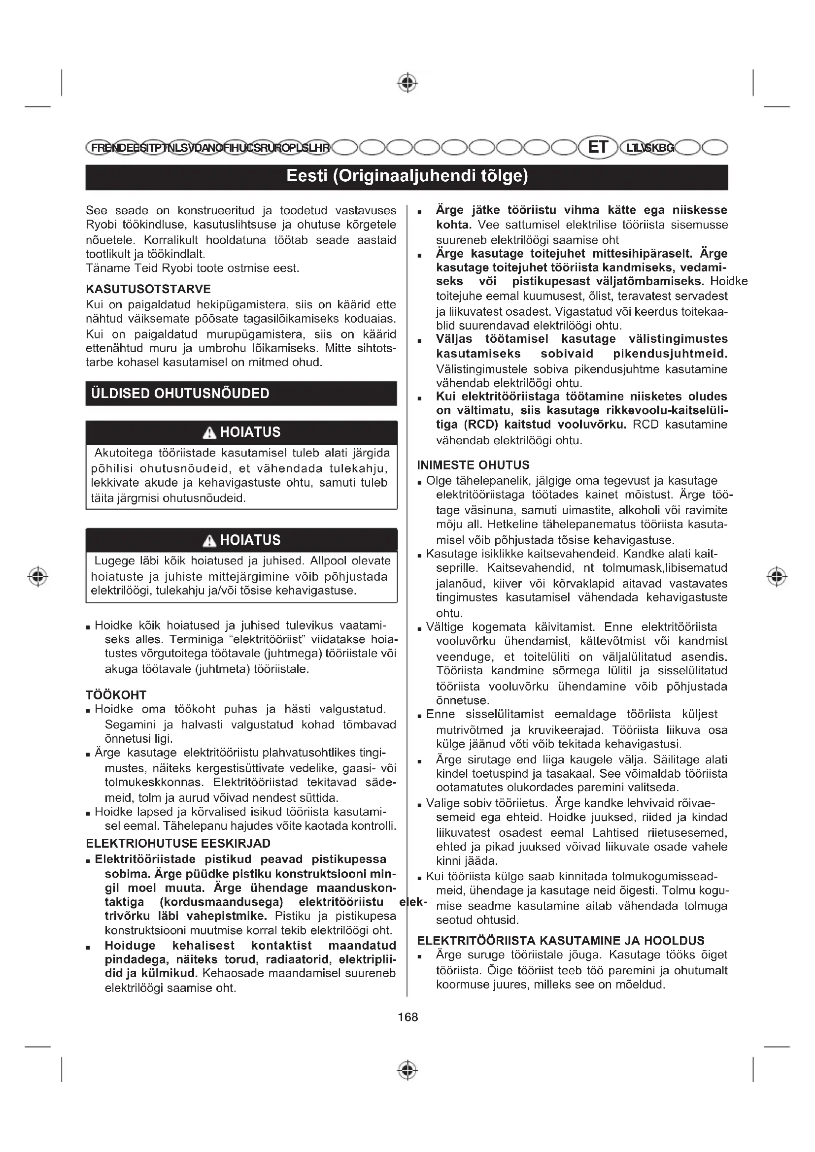 LT LV SK BG See seade on konstrueeritud ja toodetud vastavuses Ryobi töökindluse, kasutuslihtsuse ja ohutuse kõrgetele nõuetele. Korralikult hooldatuna töötab seade aastaid tootlikult ja töökindlalt. Täname Teid Ryobi toote ostmise eest. KASUTUSOTSTARVE Kui on paigaldatud hekipügamistera, siis on käärid ette nähtud väiksemate põõsate tagasilõikamiseks koduaias. Kui on paigaldatud murupügamistera, siis on käärid ettenähtud muru ja umbrohu lõikamiseks. Mitte sihtots- tarbe kohasel kasutamisel on mitmed ohud. h/',6('2+87861®8'(' HOIATUS Akutoitega tööriistade kasutamisel tuleb alati järgida põhilisi ohutusnõudeid, et vähendada tulekahju, lekkivate akude ja kehavigastuste ohtu, samuti tuleb täita järgmisi ohutusnõudeid. HOIATUS Lugege läbi kõik hoiatused ja juhised. Allpool olevate hoiatuste ja juhiste mittejärgimine võib põhjustada elektrilöögi, tulekahju ja/või tõsise kehavigastuse. ■ Hoidke kõik hoiatused ja juhised tulevikus vaatami- seks alles. Terminiga “elektritööriist” viidatakse hoia- tustes võrgutoitega töötavale (juhtmega) tööriistale või akuga töötavale (juhtmeta) tööriistale. TÖÖKOHT ■ Hoidke oma töökoht puhas ja hästi valgustatud. Segamini ja halvasti valgustatud kohad tõmbavad õnnetusi ligi. ■ Ärge kasutage elektritööriistu plahvatusohtlikes tingi- mustes, näiteks kergestisüttivate vedelike, gaasi- või tolmukeskkonnas. Elektritööriistad tekitavad säde- meid, tolm ja aurud võivad nendest süttida. ■ Hoidke lapsed ja kõrvalised isikud tööriista kasutami- sel eemal. Tähelepanu hajudes võite kaotada kontrolli. ELEKTRIOHUTUSE EESKIRJAD ■ Elektritööriistade pistikud peavad pistikupessa VRELPDbUJHSGNHSLVWLNXNRQVWUXNWVLRRQLPLQ- JLO PRHO PXXWD bUJH KHQGDJH PDDQGXVNRQ-