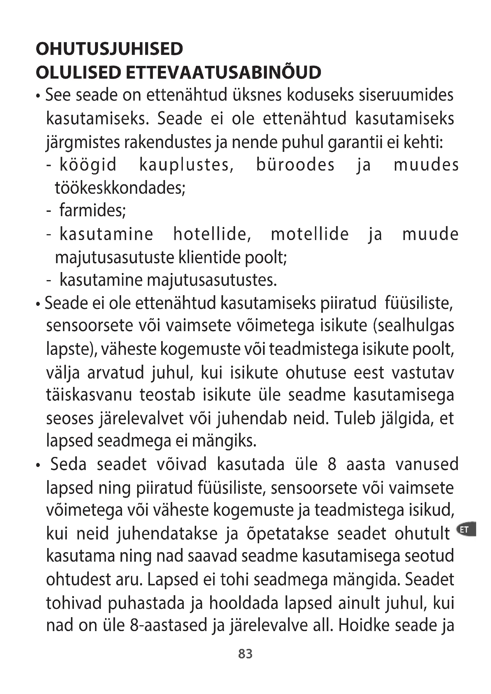 - Seda seadet võivad kasutada üle 8 aasta vanused lapsed ning piiratud füüsiliste, sensoorsete või vaimsete võimetega või väheste kogemuste ja teadmistega isikud, kui neid juhendatakse ja õpetatakse seadet ohutult kasutama ning nad saavad seadme kasutamisega seotud ohtudest aru. Lapsed ei tohi seadmega mängida. Seadet tohivad puhastada ja hooldada lapsed ainult juhul, kui nad on üle 8-aastased ja järelevalve all. Hoidke seade ja ET84 selle juhe väljaspool alla 8-aastaste laste käeulatust.