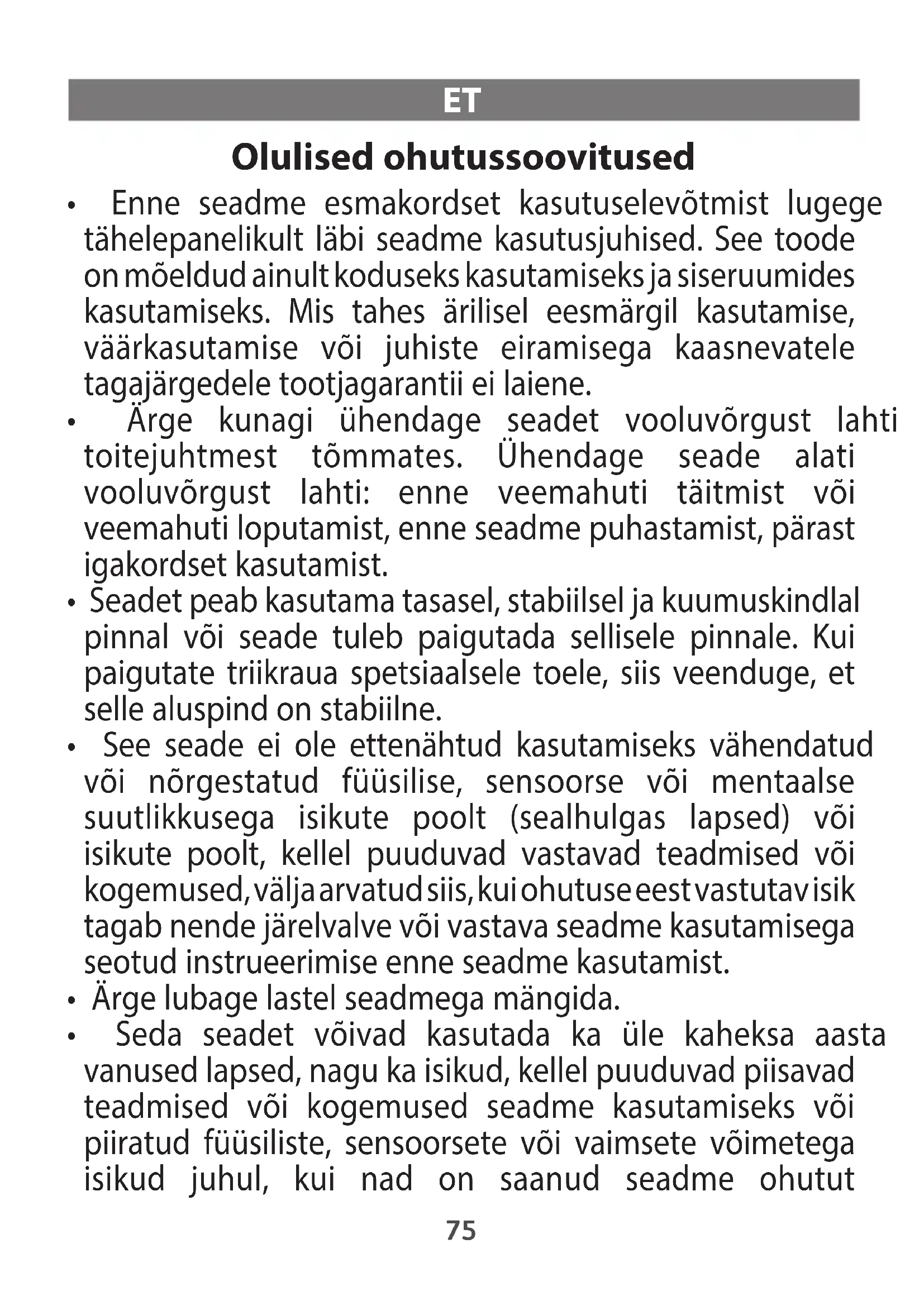 - Seda seadet võivad kasutada ka üle kaheksa aasta vanused lapsed, nagu ka isikud, kellel puuduvad piisavad teadmised või kogemused seadme kasutamiseks või piiratud füüsiliste, sensoorsete või vaimsete võimetega isikud juhul, kui nad on saanud seadme ohutut 75kasutamist tutvustava instruktaaži ja on teadlikud seadme kasutamisega kaasneda võivatest ohtudest. Lapsed ei tohi seadmega mängida. Lapsed ei tohi seadet järelevalveta puhastada ega hooldada. Hoidke triikrauda ja selle juhet alla 8aastaste laste käeulatusest väljas, kui see on sisse lülitatud või maha jahtub.