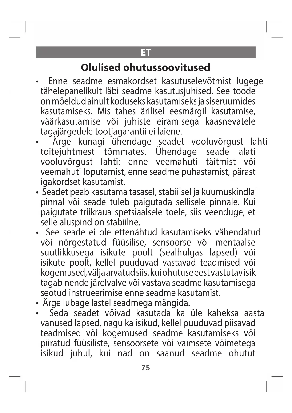 - Seda seadet võivad kasutada ka üle kaheksa aasta vanused lapsed, nagu ka isikud, kellel puuduvad piisavad teadmised või kogemused seadme kasutamiseks või piiratud füüsiliste, sensoorsete või vaimsete võimetega isikud juhul, kui nad on saanud seadme ohutut 75kasutamist tutvustava instruktaaži ja on teadlikud seadme kasutamisega kaasneda võivatest ohtudest. Lapsed ei tohi seadmega mängida. Lapsed ei tohi seadet järelevalveta puhastada ega hooldada. Hoidke triikrauda ja selle juhet alla 8aastaste laste käeulatusest väljas, kui see on sisse lülitatud või maha jahtub.