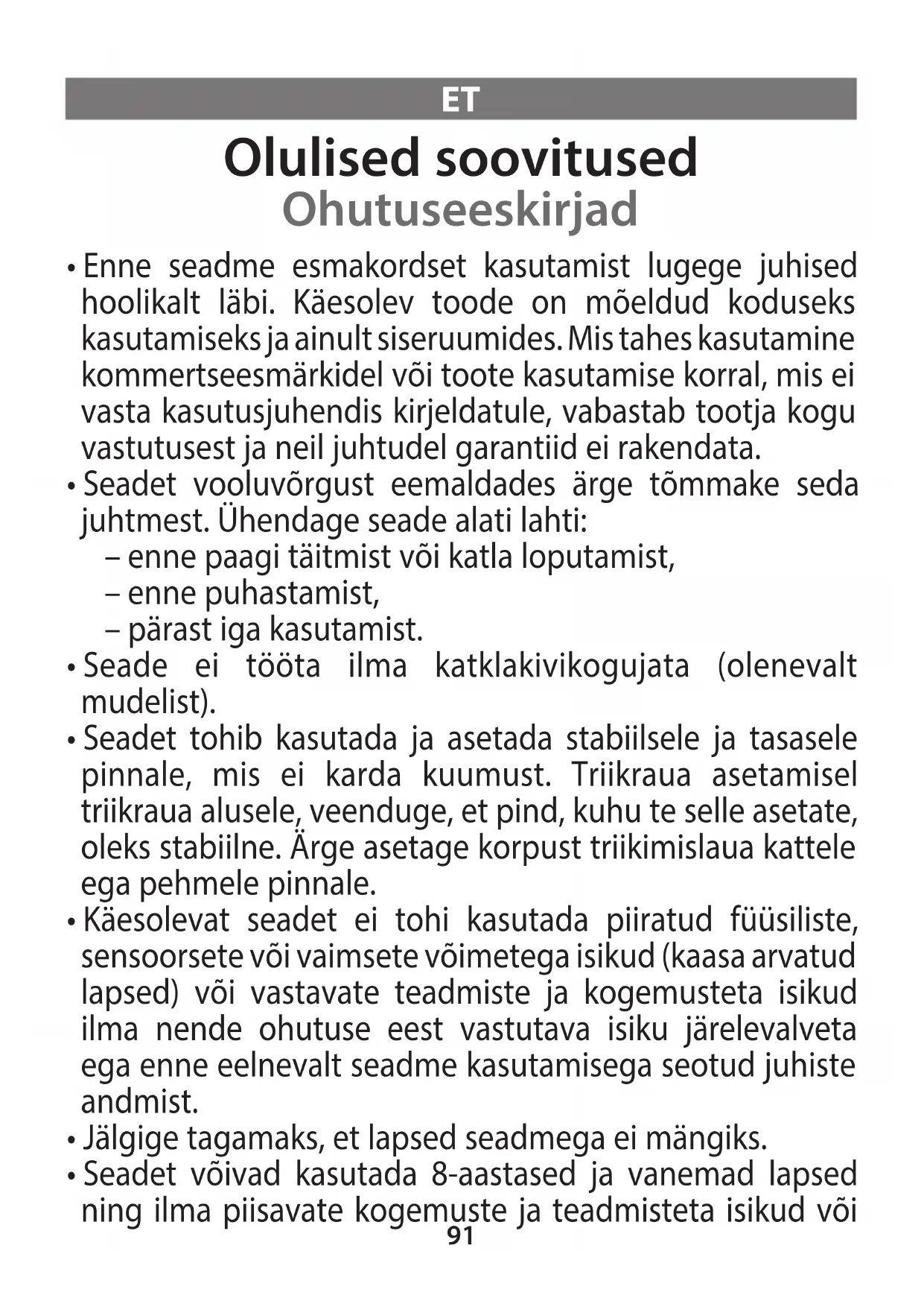 - Seadet võivad kasutada 8-aastased ja vanemad lapsed ning ilma piisavate kogemuste ja teadmisteta isikud või92 piiratud füüsiliste, sensoorsete või vaimsete võimetega inimesed, tingimusel, et neile on seadme kasutamist põhjalikult õpetatud, neid juhendatakse ning nad on teadlikud seadme kasutamisega seotud riskidest. Lapsed ei tohi seadmega mängida. Lapsed ei tohi puhastada ega hooldada seadet järelevalveta. Kui triikraud on voolu all või jahtumas, hoidke seda ja selle juhet alla 8-aastastele lastele kättesaamatus kohas.