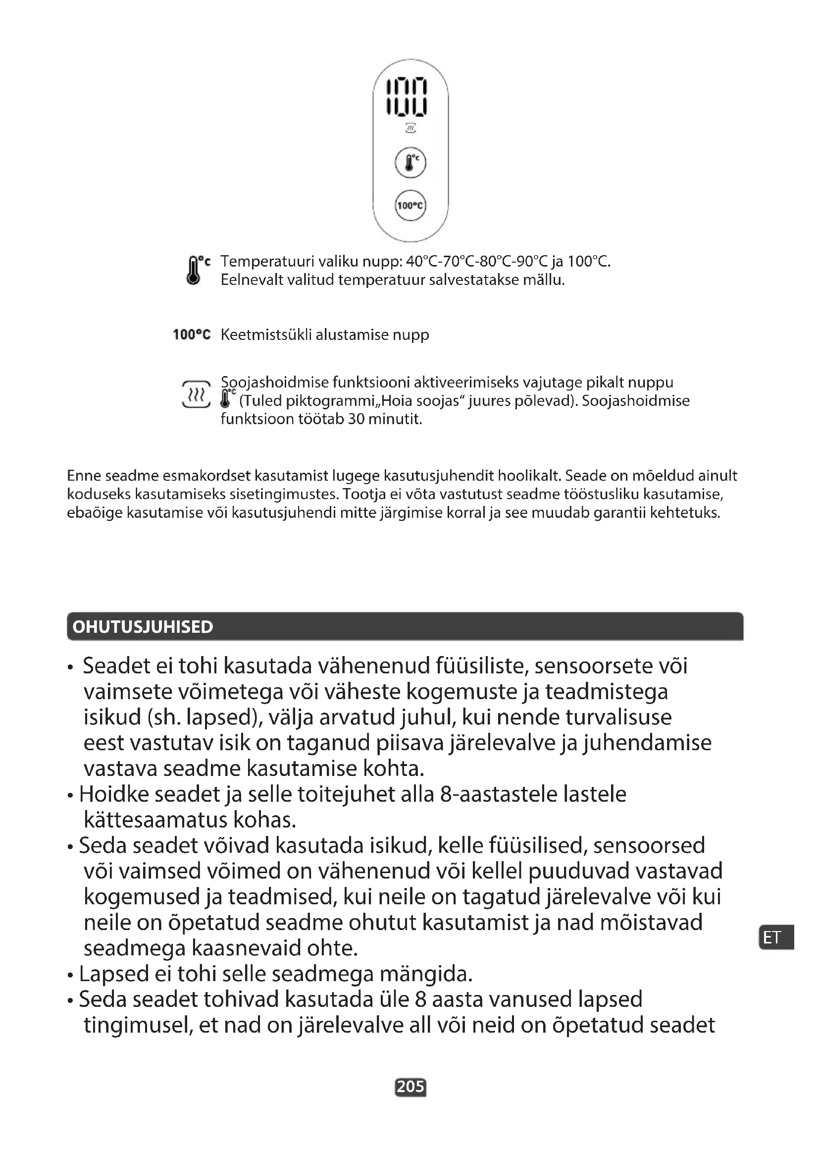 Temperatuuri valiku nupp: 40°C-70°C-80°C-90°C ja 100°C. Eelnevalt valitud temperatuur salvestatakse mällu. Keetmistsükli alustamise nupp Soojashoidmise funktsiooni aktiveerimiseks vajutage pikalt nuppu (Tuled piktogrammi„Hoia soojas“ juures põlevad). Soojashoidmise funktsioon töötab 30 minutit.206 ohutult kasutama ning nad mõistavad seadme kasutamisega kaasnevaid ohte. Lapsed ei tohi seadet puhastada ja hooldada, välja arvatud üle 8 aasta vanused lapsed, keda juhendab täiskasvanu.