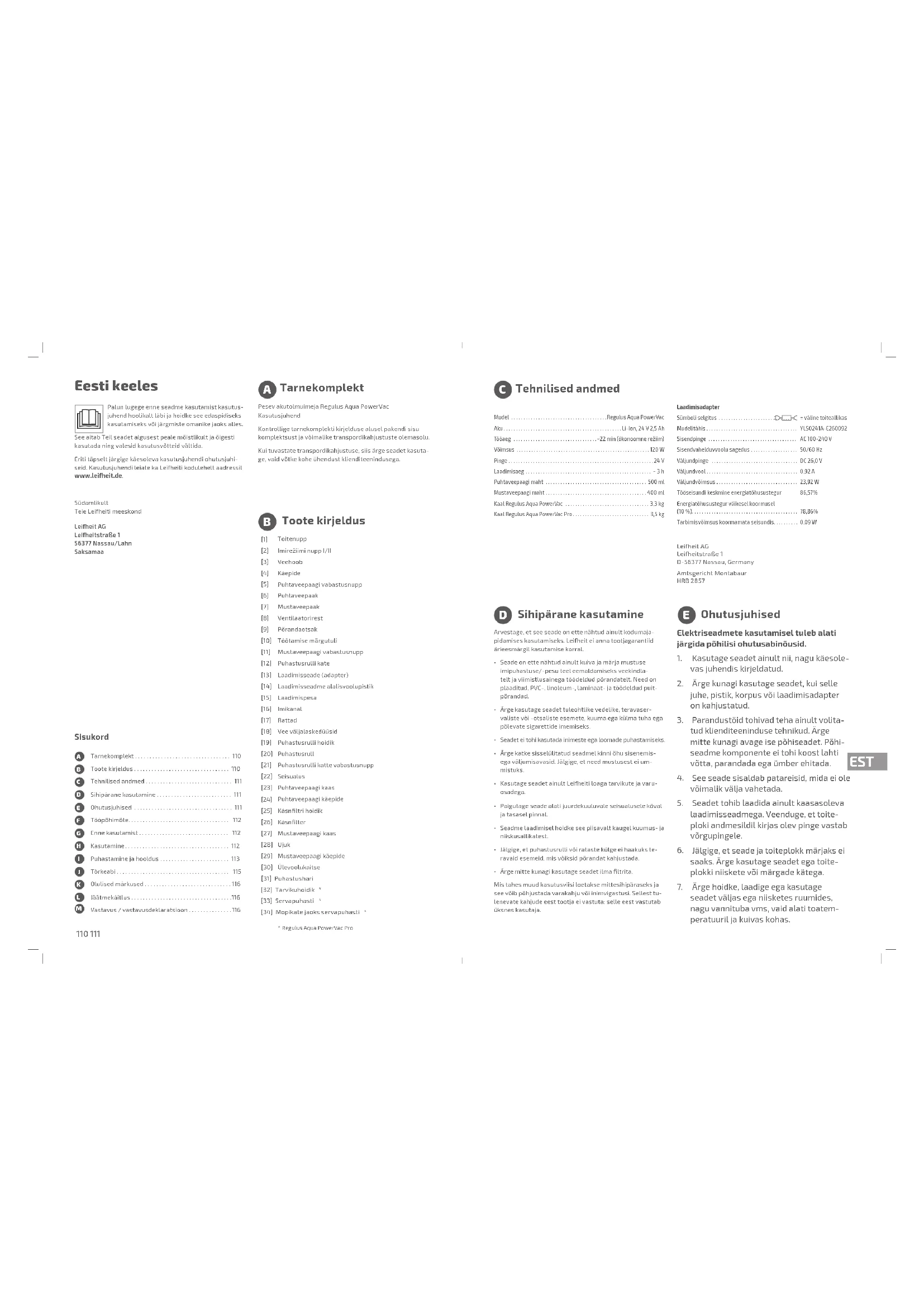 Palun lugege enne seadme kasutamist kasutus-juhend hoolikalt läbi ja hoidke see edaspidiseks kasutamiseks või järgmiste omanike jaoks alles. See aitab Teil seadet algusest peale mõistlikult ja õigesti kasutada ning valesid kasutusvõtteid vältida.Eriti täpselt järgige käesoleva kasutusjuhendi ohutusjuhi-seid. Kasutusjuhendi leiate ka Leifheiti kodulehelt aadressil www.leifheit.de.Südamlikult Teie Leifheiti meeskondLeifheit AG Leifheitstraße 1 56377 Nassau/Lahn Saksamaa Sisukord