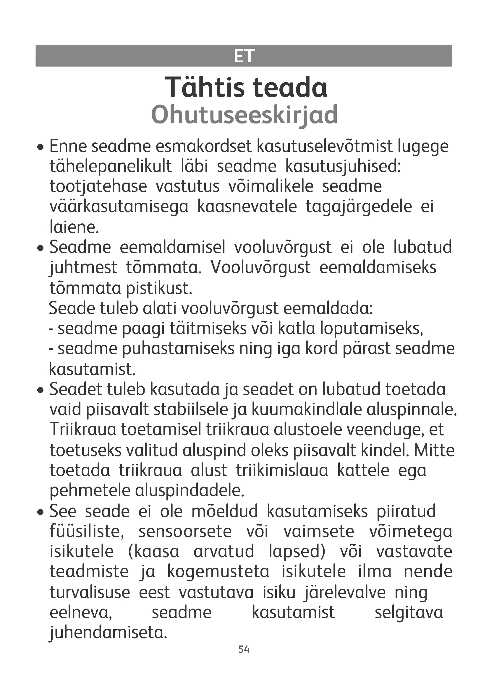 - Seda seadet võivad kasutada ka üle kaheksa aasta vanused lapsed, nagu ka isikud, kellel puuduvad piisavad teadmised või kogemused seadme kasutamiseks või piiratud füüsiliste, sensoorsete või vaimsete võimetega isikud juhul, kui nad on saanud seadme ohutut kasutamist tutvustava instruktaaži ja on teadlikud seadme kasutamisega kaasneda võivatest ohtudest. Seadet ei ole lubatud anda lastele mängimiseks. Lastel ei ole lubatud teha kasutaja pädevusse jäävaid puhastus- ja hooldusoperatsioone, välja arvatud juhul, kui nad on vanemad kui kaheksa aastat ja nende tegevust kontrollitakse. Jälgige, et seade või selle toitejuhe ei satuks alla kaheksa-aastaste laste käeulatusse.