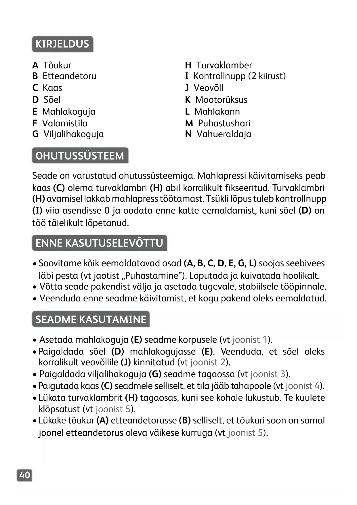 SEADME KASUTAMINE A Tõukur B Etteandetoru C Kaas D Sõel E Mahlakoguja F Valamistila G Viljalihakoguja H Turvaklamber I Kontrollnupp (2 kiirust) J Veovõll K Mootorüksus L Mahlakann M Puhastushari N Vahueraldaja Seade on varustatud ohutussüsteemiga. Mahlapressi käivitamiseks peab kaas (C) olema turvaklambri (H) abil korralikult fikseeritud. Turvaklambri (H) avamisel lakkab mahlapress töötamast. Tsükli lõpus tuleb kontrollnupp (I) viia asendisse 0 ja oodata enne katte eemaldamist, kuni sõel (D) on töö täielikult lõpetanud.