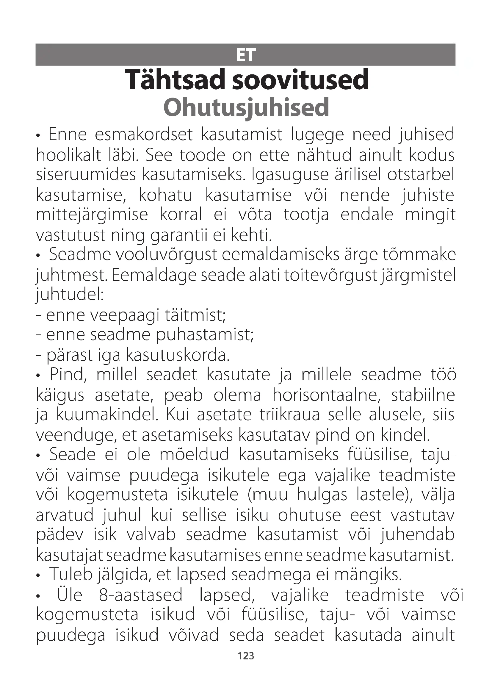- Seade ei ole mõeldud kasutamiseks füüsilise, taju- või vaimse puudega isikutele ega vajalike teadmiste või kogemusteta isikutele (muu hulgas lastele), välja arvatud juhul kui sellise isiku ohutuse eest vastutav pädev isik valvab seadme kasutamist või juhendab kasutajat seadme kasutamises enne seadme kasutamist.