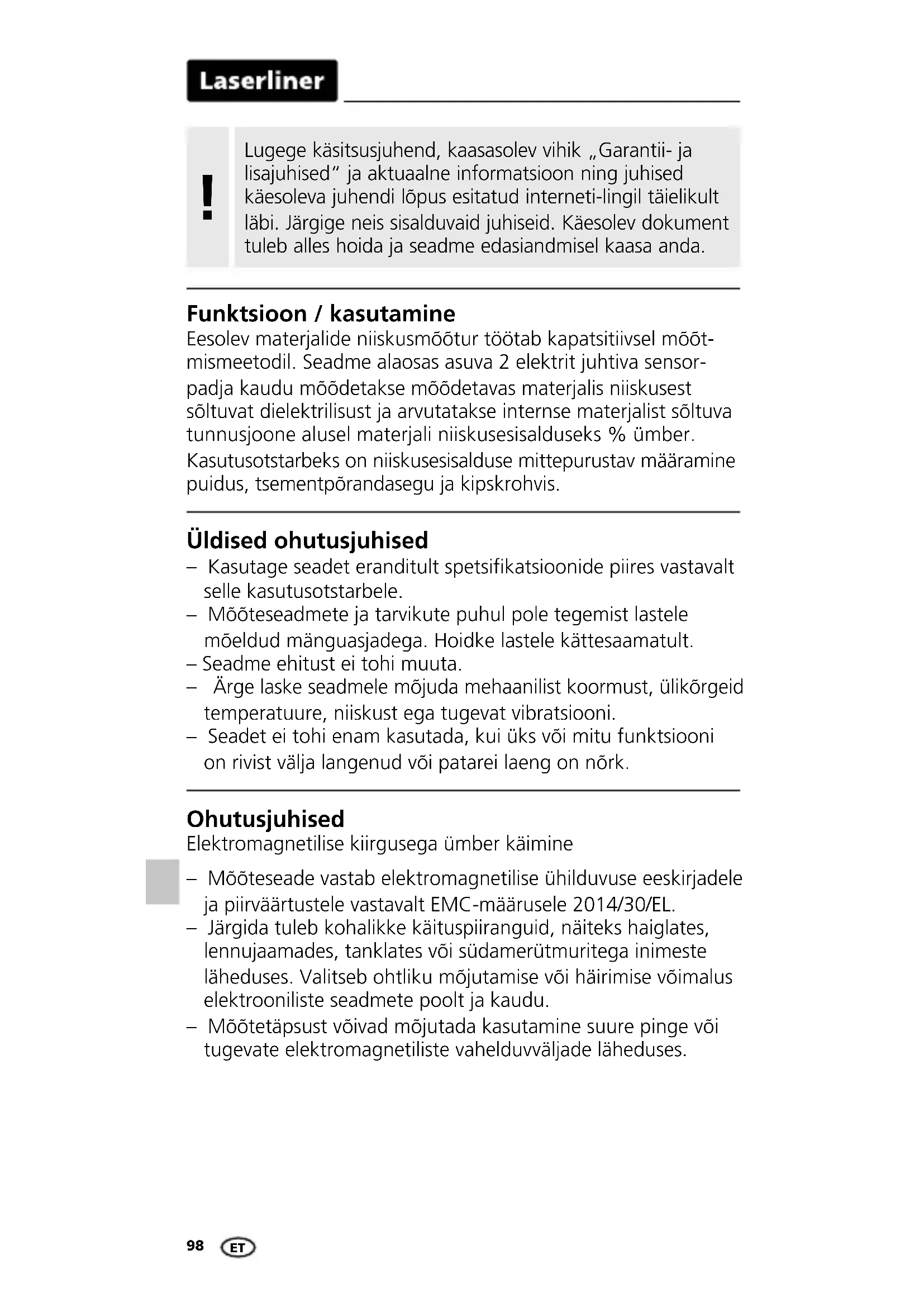 Funktsioon / kasutamine Eesolev materjalide niiskusmõõtur töötab kapatsitiivsel mõõt- mismeetodil. Seadme alaosas asuva 2 elektrit juhtiva sensor- padja kaudu mõõdetakse mõõdetavas materjalis niiskusest sõltuvat dielektrilisust ja arvutatakse internse materjalist sõltuva tunnusjoone alusel materjali niiskusesisalduseks % ümber. Kasutusotstarbeks on niiskusesisalduse mittepurustav määramine puidus, tsementpõrandasegu ja kipskrohvis. Üldised ohutusjuhised – Kasutage seadet eranditult spetsikatsioonide piires vastavalt selle kasutusotstarbele. – Mõõteseadmete ja tarvikute puhul pole tegemist lastele mõeldud mänguasjadega. Hoidke lastele kättesaamatult. – Seadme ehitust ei tohi muuta. – Ärge laske seadmele mõjuda mehaanilist koormust, ülikõrgeid temperatuure, niiskust ega tugevat vibratsiooni. – Seadet ei tohi enam kasutada, kui üks või mitu funktsiooni on rivist välja langenud või patarei laeng on nõrk. Ohutusjuhised Elektromagnetilise kiirgusega ümber käimine – Mõõteseade vastab elektromagnetilise ühilduvuse eeskirjadele ja piirväärtustele vastavalt EMC-määrusele 2014/30/EL. – Järgida tuleb kohalikke käituspiiranguid, näiteks haiglates, lennujaamades, tanklates või südamerütmuritega inimeste läheduses. Valitseb ohtliku mõjutamise või häirimise võimalus elektrooniliste seadmete poolt ja kaudu. – Mõõtetäpsust võivad mõjutada kasutamine suure pinge või tugevate elektromagnetiliste vahelduvväljade läheduses.MoistureFinder Compact
