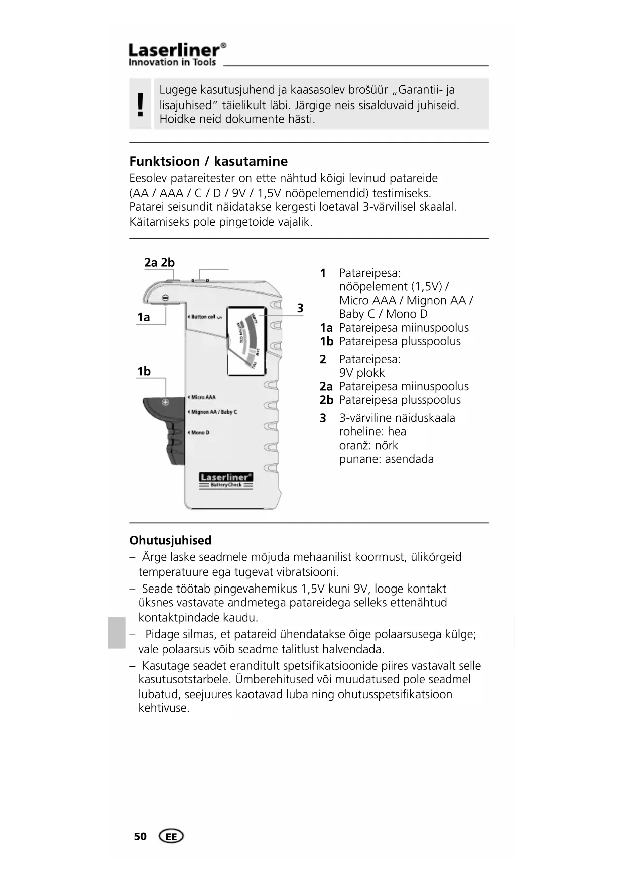 ELi nõuded ja utiliseerimine Seade täidab kõik nõutavad normid vabaks kaubavahetuseks EL-i piires. Käesolev toode on elektriseade ja tuleb vastavalt Euroopa direktiivile elektri- ja elektroonikaseadmete jäätmete kohta eraldi koguda ning kõrvaldada. Edasised ohutus- ja lisajuhised aadressil: www.laserliner.com/infoBatteryCheck