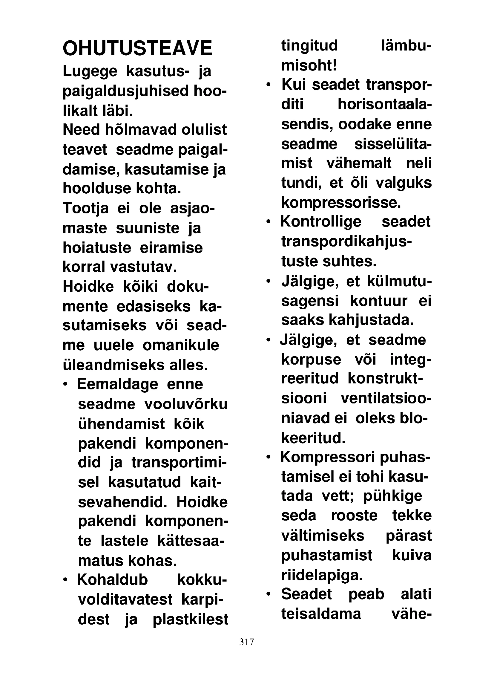 - Kui seadet transpor- diti horisontaala- sendis, oodake enne seadme sisselülita- mist vähemalt neli tundi, et õli valguks kompressorisse.