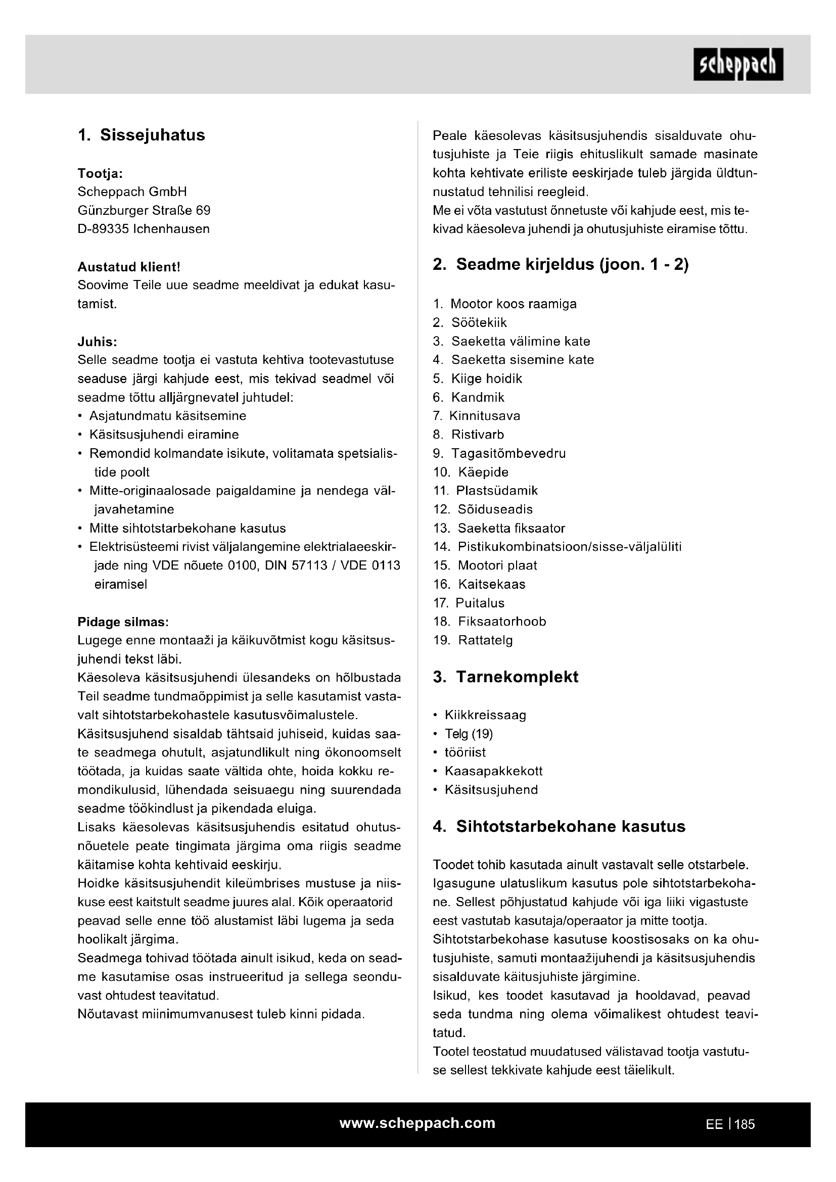 Tootja: Scheppach GmbH Günzburger Straße 69 D-89335 Ichenhausen Austatud klient! Soovime Teile uue seadme meeldivat ja edukat kasu- tamist. Juhis: Selle seadme tootja ei vastuta kehtiva tootevastutuse seaduse järgi kahjude eest, mis tekivad seadmel või seadme tõttu alljärgnevatel juhtudel: