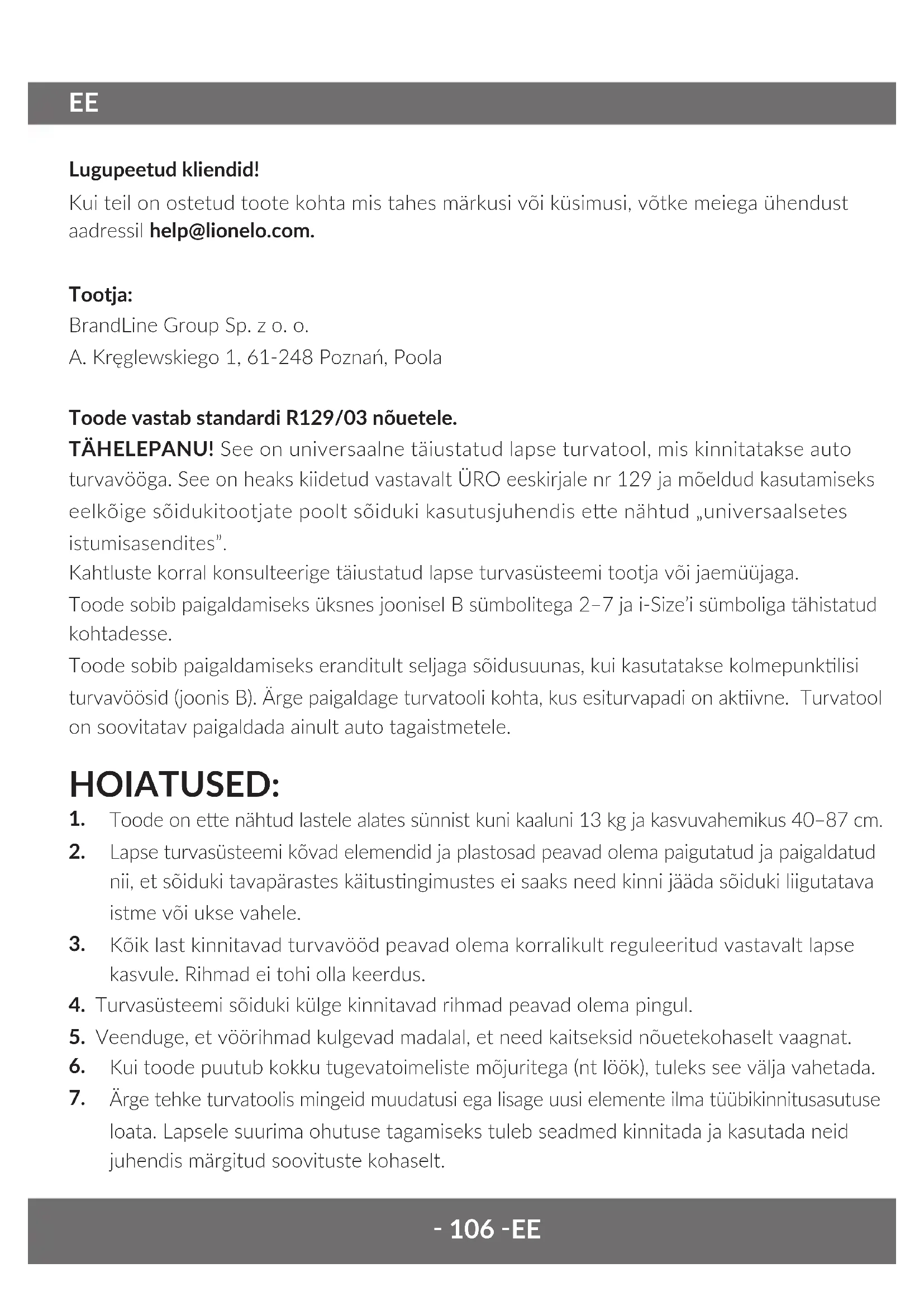 - Προσοχή! Μην χρησιμοποιείτε ισχυρά απορρυπαντικά ή λευκαντικά. Οι φωτογραφίες είναι μόνο για ενδεικτικούς σκοπούς, η πραγματική εμφάνιση των προϊόντων μπορεί να διαφέρει από αυτή που απεικονίζεται στις εικόνες.‑ 106 ‑EE Lugupeetud kliendid! Kui teil on ostetud toote kohta mis tahes märkusi või küsimusi, võtke meiega ühendust aadressil help@lionelo.com. Tootja: BrandLine Group Sp. z o. o. A. Kręglewskiego 1, 61-248 Poznań, Poola Toode vastab standardi R129/03 nõuetele. TÄHELEPANU! See on universaalne täiustatud lapse turvatool, mis kinnitatakse auto turvavööga. See on heaks kiidetud vastavalt ÜRO eeskirjale nr 129 ja mõeldud kasutamiseks eelkõige sõidukitootjate poolt sõiduki kasutusjuhendis ee nähtud „universaalsetes istumisasendites”. Kahtluste korral konsulteerige täiustatud lapse turvasüsteemi tootja või jaemüüjaga. Toode sobib paigaldamiseks üksnes joonisel B sümbolitega 2–7 ja i-Size’i sümboliga tähistatud kohtadesse. Toode sobib paigaldamiseks eranditult seljaga sõidusuunas, kui kasutatakse kolmepunklisi turvavöösid (joonis B). Ärge paigaldage turvatooli kohta, kus esiturvapadi on akivne. Turvatool on soovitatav paigaldada ainult auto tagaistmetele. HOIATUSED: