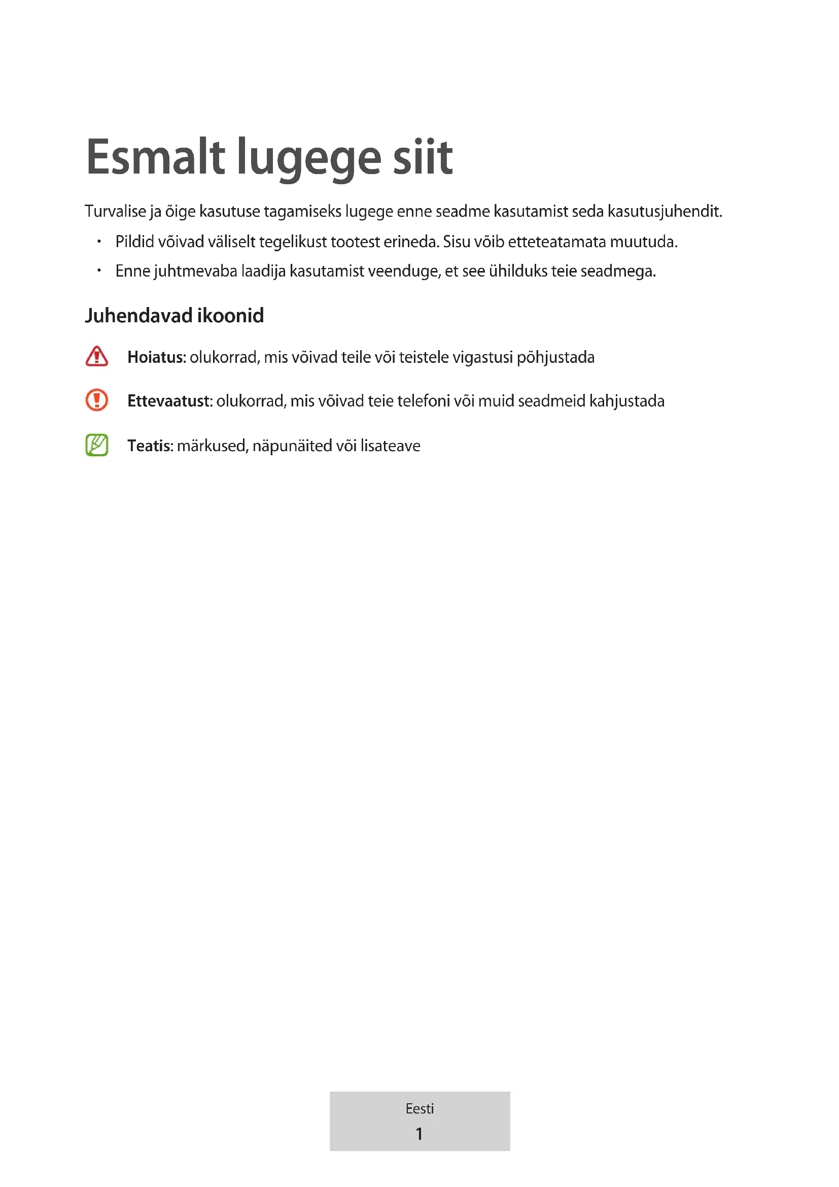 Enne juhtmevaba laadija kasutamist veenduge, et see ühilduks teie seadmega. Juhendavad ikoonid Hoiatus: olukorrad, mis võivad teile või teistele vigastusi põhjustada Ettevaatust: olukorrad, mis võivad teie telefoni või muid seadmeid kahjustada Teatis: märkused, näpunäited või lisateave2 Eesti Alustamine Pakendi sisu Veenduge, et tootekarbis on järgmised esemed: