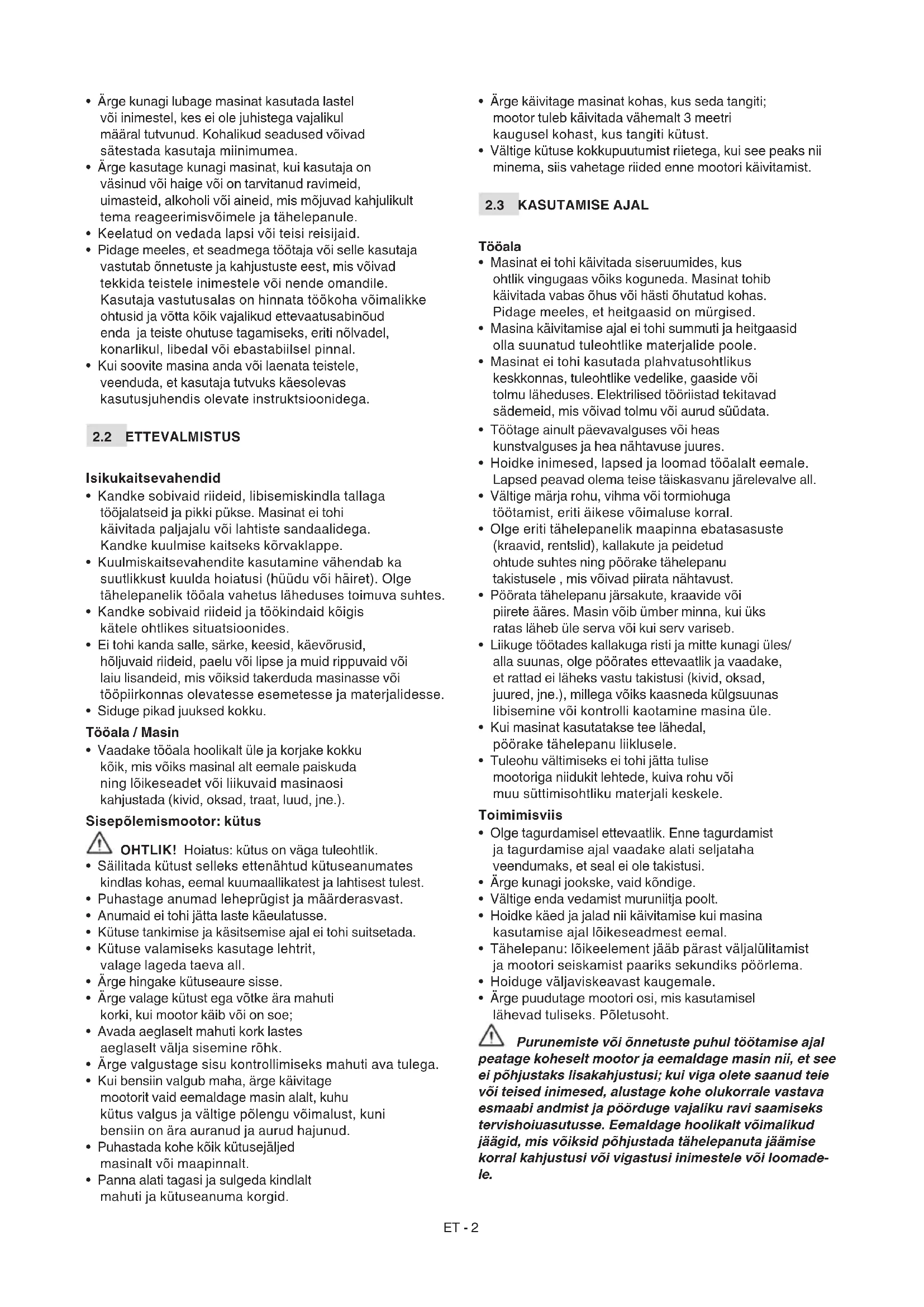 - Ärge puudutage mootori osi, mis kasutamisel lähevad tuliseks. Põletusoht. Purunemiste või õnnetuste puhul töötamise ajal peatage koheselt mootor ja eemaldage masin nii, et see ei põhjustaks lisakahjustusi; kui viga olete saanud teie või teised inimesed, alustage kohe olukorrale vastava esmaabi andmist ja pöörduge vajaliku ravi saamiseks tervishoiuasutusse. Eemaldage hoolikalt võimalikud jäägid, mis võiksid põhjustada tähelepanuta jäämise korral kahjustusi või vigastusi inimestele või loomade- le.ET - 3 Kasutuspiirangud