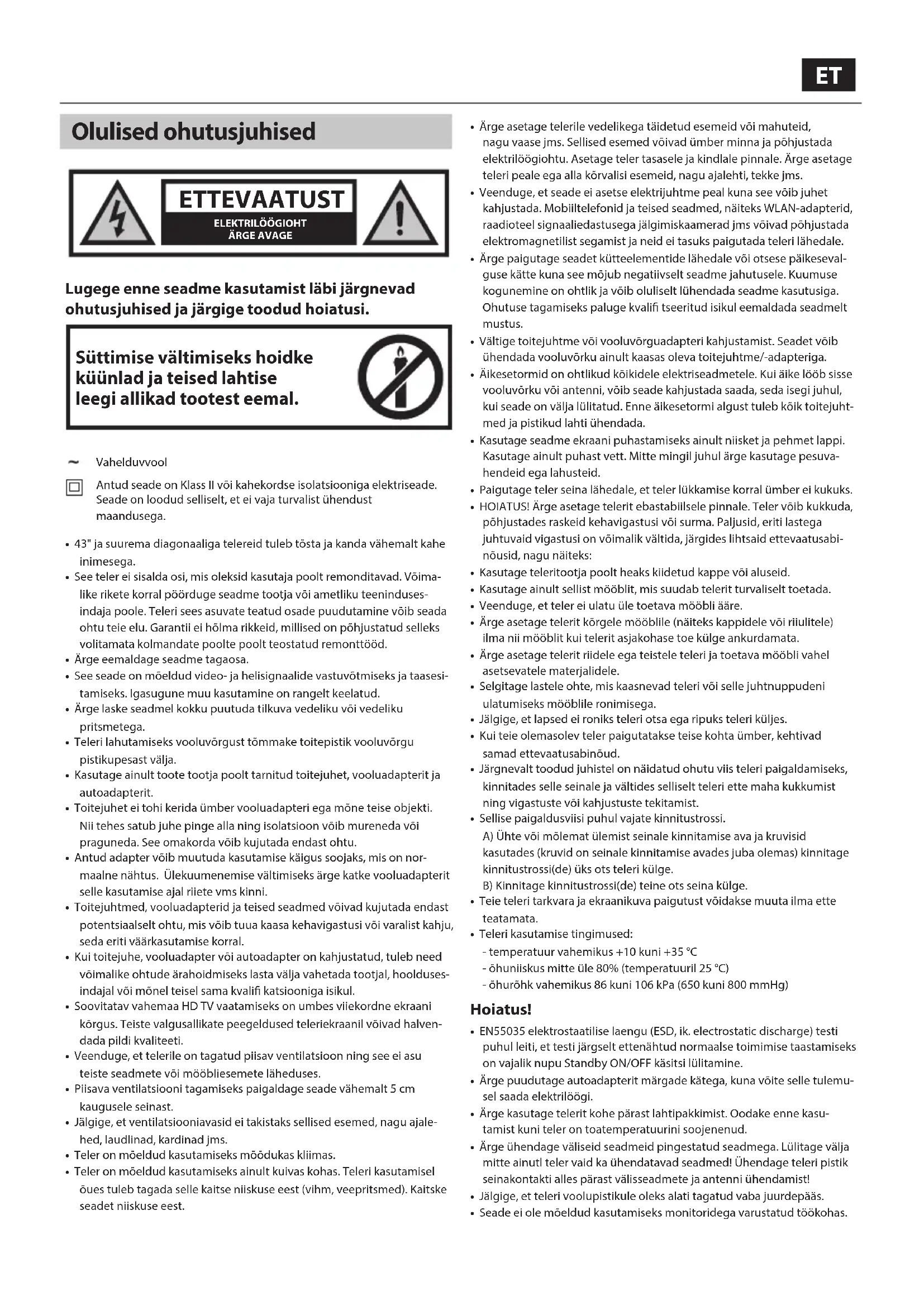 - 43" ja suurema diagonaaliga telereid tuleb tõsta ja kanda vähemalt kahe inimesega.