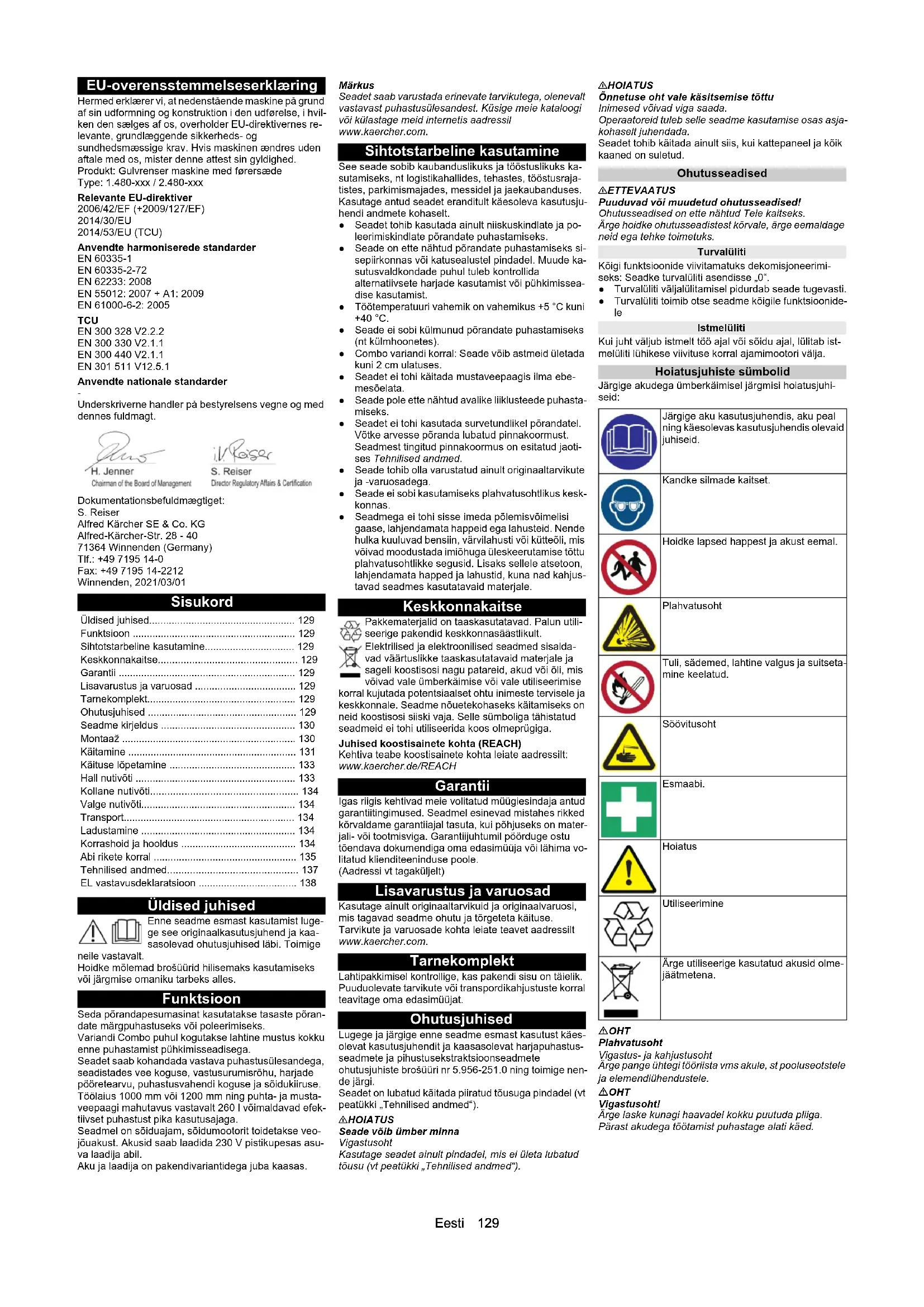 210 210 168 168 42 42138 Latviešu Õigus tehnilisteks muudatusteks. EL vastavusdeklaratsioon Käesolevaga deklareerime, et alljärgnevalt nimetatud masin vastab oma kontseptsiooni ja koosteliigi põhjal ning meie poolt turule viidud teostuses EL direktiivide asjaomastele põhilistele ohutus- ja tervisenõuetele. Ma- sinal meiega kooskõlastamata muudatuste teostamisel kaotab käesolev deklaratsioon kehtivuse. Toode: Pealeistutav põrandapuhastusmasin Tüüp: 1.480-xxx / 2.480-xxx Asjaomased EL direktiivid 2006/42/EÜ (+2009/127/EÜ) 2014/30/EL 2014/53/EL (TCU) Kohaldatud ühtlustatud normid EN 60335-1 EN 60335-2-72 EN 62233: 2008 EN 55012: 2007 + A1: 2009 EN 61000-6-2: 2005 TCU EN 300 328 V2.2.2 EN 300 330 V2.1.1 EN 300 440 V2.1.1 EN 301 511 V12.5.1 Kohaldatud riiklikud normid