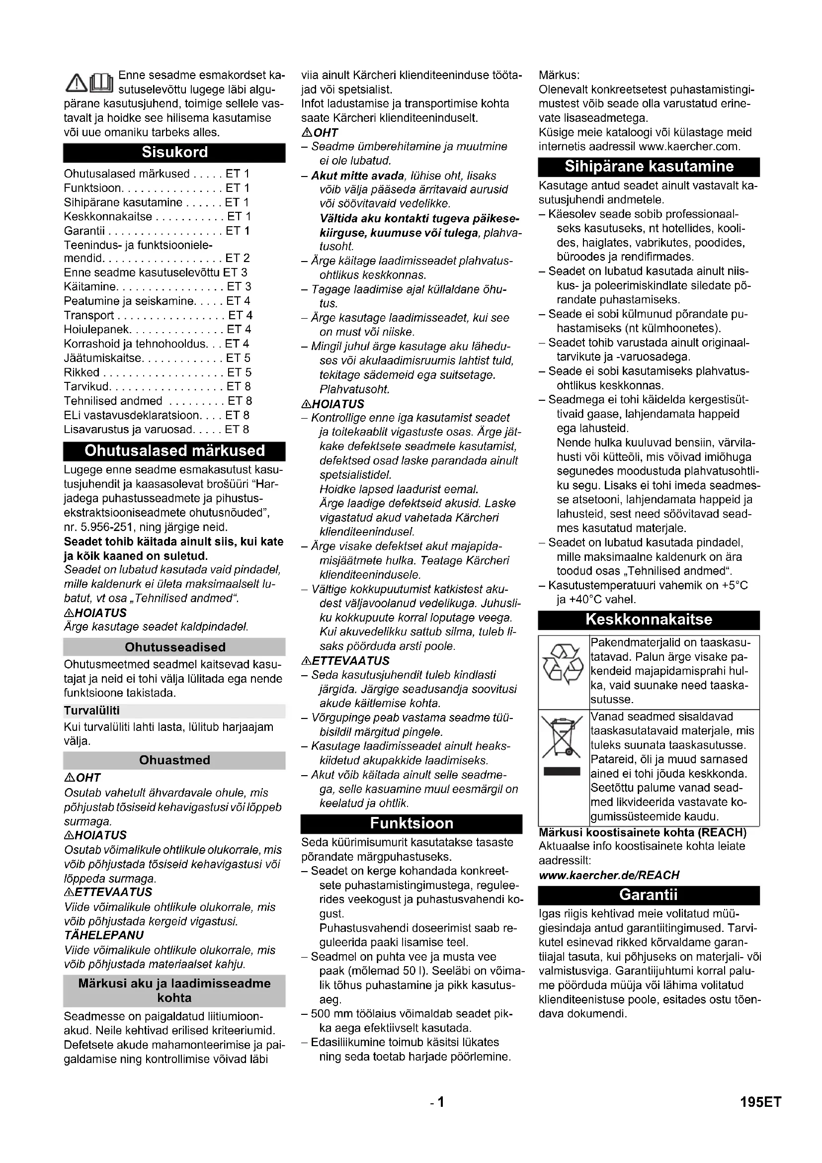 Chairman of the Board of Management Director Regulatory Affairs & Certification Принадлежности и резервни части 194 BG- 1 Enne sesadme esmakordset ka- sutuselevõttu lugege läbi algu- pärane kasutusjuhend, toimige sellele vas- tavalt ja hoidke see hilisema kasutamise või uue omaniku tarbeks alles. Lugege enne seadme esmakasutust kasu- tusjuhendit ja kaasasolevat brošüüri “Har- jadega puhastusseadmete ja pihustus- ekstraktsiooniseadmete ohutusnõuded”, nr. 5.956-251, ning järgige neid. Seadet tohib käitada ainult siis, kui kate ja kõik kaaned on suletud. Seadet on lubatud kasutada vaid pindadel, mille kaldenurk ei ületa maksimaalselt lu- batut, vt osa „Tehnilised andmed“. 몇 HOIATUS Ärge kasutage seadet kaldpindadel. Ohutusmeetmed seadmel kaitsevad kasu- tajat ja neid ei tohi välja lülitada ega nende funktsioone takistada. Kui turvalüliti lahti lasta, lülitub harjaajam välja. OHT Osutab vahetult ähvardavale ohule, mis põhjustab tõsiseid kehavigastusi või lõppeb surmaga. 몇 HOIATUS Osutab võimalikule ohtlikule olukorrale, mis võib põhjustada tõsiseid kehavigastusi või lõppeda surmaga. 몇 ETTEVAATUS Viide võimalikule ohtlikule olukorrale, mis võib põhjustada kergeid vigastusi. TÄHELEPANU Viide võimalikule ohtlikule olukorrale, mis võib põhjustada materiaalset kahju. Seadmesse on paigaldatud liitiumioon- akud. Neile kehtivad erilised kriteeriumid. Defetsete akude mahamonteerimise ja pai- galdamise ning kontrollimise võivad läbi viia ainult Kärcheri klienditeeninduse tööta- jad või spetsialist. Infot ladustamise ja transportimise kohta saate Kärcheri klienditeeninduselt. OHT – Seadme ümberehitamine ja muutmine ei ole lubatud. – Akut mitte avada, lühise oht, lisaks võib välja pääseda ärritavaid aurusid või söövitavaid vedelikke. Vältida aku kontakti tugeva päikese- kiirguse, kuumuse või tulega, plahva- tusoht. – Ärge käitage laadimisseadet plahvatus- ohtlikus keskkonnas. – Tagage laadimise ajal küllaldane õhu- tus. – Ärge kasutage laadimisseadet, kui see on must või niiske. – Mingil juhul ärge kasutage aku lähedu- ses või akulaadimisruumis lahtist tuld, tekitage sädemeid ega suitsetage. Plahvatusoht. 몇 HOIATUS – Kontrollige enne iga kasutamist seadet ja toitekaablit vigastuste osas. Ärge jät- kake defektsete seadmete kasutamist, defektsed osad laske parandada ainult spetsialistidel. Hoidke lapsed laadurist eemal. Ärge laadige defektseid akusid. Laske vigastatud akud vahetada Kärcheri klienditeenindusel. – Ärge visake defektset akut majapida- misjäätmete hulka. Teatage Kärcheri klienditeenindusele. – Vältige kokkupuutumist katkistest aku- dest väljavoolanud vedelikuga. Juhusli- ku kokkupuute korral loputage veega. Kui akuvedelikku sattub silma, tuleb li- saks pöörduda arsti poole. 몇 ETTEVAATUS – Seda kasutusjuhendit tuleb kindlasti järgida. Järgige seadusandja soovitusi akude käitlemise kohta. – Võrgupinge peab vastama seadme tüü- bisildil märgitud pingele. – Kasutage laadimisseadet ainult heaks- kiidetud akupakkide laadimiseks. – Akut võib käitada ainult selle seadme- ga, selle kasuamine muul eesmärgil on keelatud ja ohtlik. Seda küürimisumurit kasutatakse tasaste põrandate märgpuhastuseks. – Seadet on kerge kohandada konkreet- sete puhastamistingimustega, regulee- rides veekogust ja puhastusvahendi ko- gust. Puhastusvahendi doseerimist saab re- guleerida paaki lisamise teel. – Seadmel on puhta vee ja musta vee paak (mõlemad 50 l). Seeläbi on võima- lik tõhus puhastamine ja pikk kasutus- aeg. – 500 mm töölaius võimaldab seadet pik- ka aega efektiivselt kasutada. – Edasiliikumine toimub käsitsi lükates ning seda toetab harjade pöörlemine. Märkus: Olenevalt konkreetsetest puhastamistingi- mustest võib seade olla varustatud erine- vate lisaseadmetega. Küsige meie kataloogi või külastage meid internetis aadressil www.kaercher.com. Kasutage antud seadet ainult vastavalt ka- sutusjuhendi andmetele. – Käesolev seade sobib professionaal- seks kasutuseks, nt hotellides, kooli- des, haiglates, vabrikutes, poodides, büroodes ja rendifirmades. – Seadet on lubatud kasutada ainult niis- kus- ja poleerimiskindlate siledate põ- randate puhastamiseks. – Seade ei sobi külmunud põrandate pu- hastamiseks (nt külmhoonetes). – Seadet tohib varustada ainult originaal- tarvikute ja -varuosadega. – Seade ei sobi kasutamiseks plahvatus- ohtlikus keskkonnas. – Seadmega ei tohi käidelda kergestisüt- tivaid gaase, lahjendamata happeid ega lahusteid. Nende hulka kuuluvad bensiin, värvila- husti või kütteõli, mis võivad imiõhuga segunedes moodustuda plahvatusohtli- ku segu. Lisaks ei tohi imeda seadmes- se atsetooni, lahjendamata happeid ja lahusteid, sest need söövitavad sead- mes kasutatud materjale. – Seadet on lubatud kasutada pindadel, mille maksimaalne kaldenurk on ära toodud osas „Tehnilised andmed“. – Kasutustemperatuuri vahemik on +5°C ja +40°C vahel. Märkusi koostisainete kohta (REACH) Aktuaalse info koostisainete kohta leiate aadressilt: www.kaercher.de/REACH Igas riigis kehtivad meie volitatud müü- giesindaja antud garantiitingimused. Tarvi- kutel esinevad rikked kõrvaldame garan- tiiajal tasuta, kui põhjuseks on materjali- või valmistusviga. Garantiijuhtumi korral palu- me pöörduda müüja või lähima volitatud klienditeenistuse poole, esitades ostu tõen- dava dokumendi. Sisukord Ohutusalased märkused . . . . . ET 1 Funktsioon. . . . . . . . . . . . . . . . ET 1 Sihipärane kasutamine . . . . . . ET 1 Keskkonnakaitse . . . . . . . . . . . ET 1 Garantii . . . . . . . . . . . . . . . . . . ET 1 Teenindus- ja funktsiooniele- mendid. . . . . . . . . . . . . . . . . . . ET 2 Enne seadme kasutuselevõttu ET 3 Käitamine. . . . . . . . . . . . . . . . . ET 3 Peatumine ja seiskamine. . . . . ET 4 Transport . . . . . . . . . . . . . . . . . ET 4 Hoiulepanek. . . . . . . . . . . . . . . ET 4 