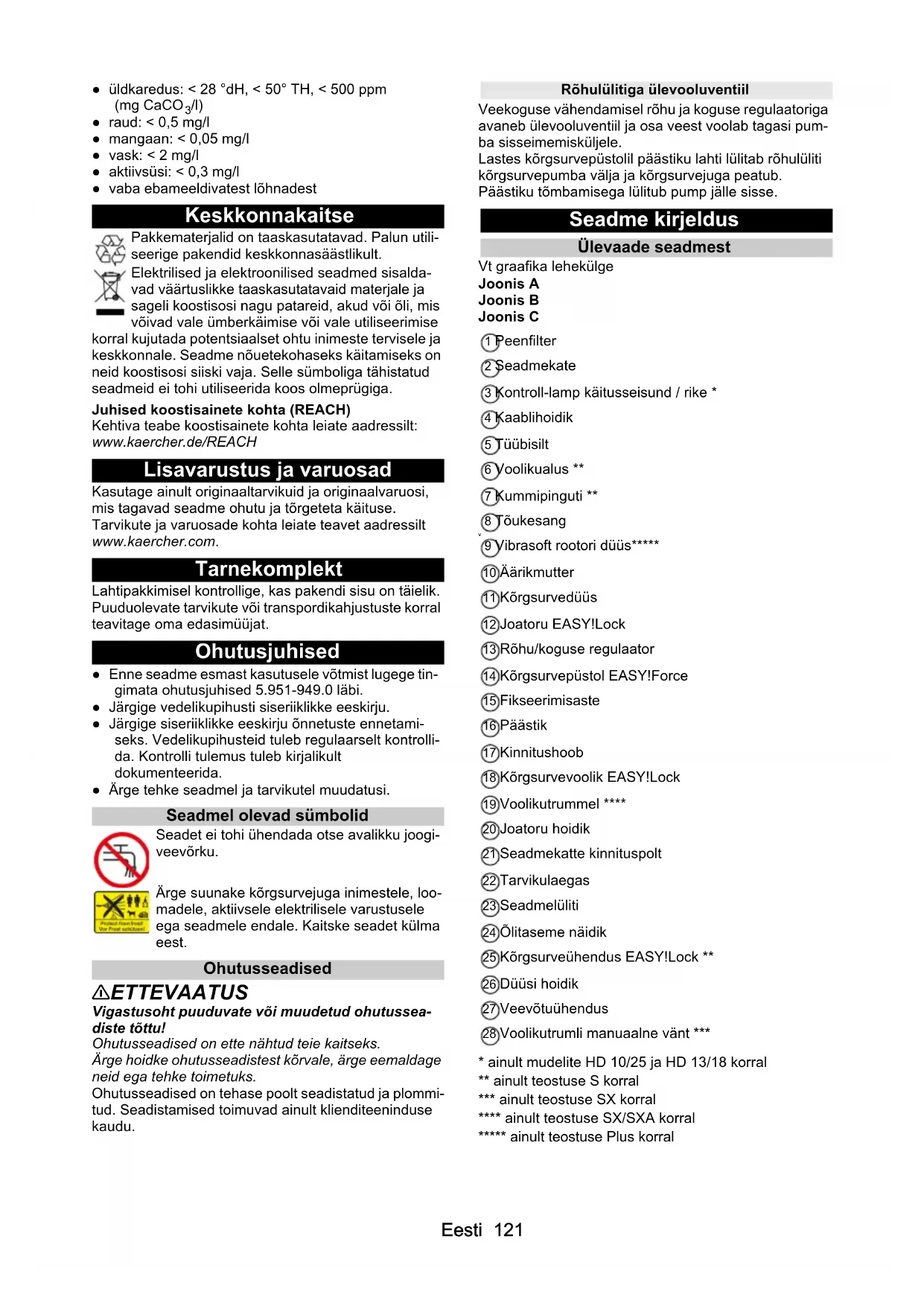 /l) ● raud: < 0,5 mg/l ● mangaan: < 0,05 mg/l ● vask: < 2 mg/l ● aktiivsüsi: < 0,3 mg/l ● vaba ebameeldivatest lõhnadest Keskkonnakaitse Pakkematerjalid on taaskasutatavad. Palun utili- seerige pakendid keskkonnasäästlikult. Elektrilised ja elektroonilised seadmed sisalda- vad väärtuslikke taaskasutatavaid materjale ja sageli koostisosi nagu patareid, akud või õli, mis võivad vale ümberkäimise või vale utiliseerimise korral kujutada potentsiaalset ohtu inimeste tervisele ja keskkonnale. Seadme nõuetekohaseks käitamiseks on neid koostisosi siiski vaja. Selle sümboliga tähistatud seadmeid ei tohi utiliseerida koos olmeprügiga. Juhised koostisainete kohta (REACH) Kehtiva teabe koostisainete kohta leiate aadressilt: www.kaercher.de/REACH Lisavarustus ja varuosad Kasutage ainult originaaltarvikuid ja originaalvaruosi, mis tagavad seadme ohutu ja tõrgeteta käituse. Tarvikute ja varuosade kohta leiate teavet aadressilt www.kaercher.com. Tarnekomplekt Lahtipakkimisel kontrollige, kas pakendi sisu on täielik. Puuduolevate tarvikute või transpordikahjustuste korral teavitage oma edasimüüjat. Ohutusjuhised ● Enne seadme esmast kasutusele võtmist lugege tin- gimata ohutusjuhised 5.951-949.0 läbi. ● Järgige vedelikupihusti siseriiklikke eeskirju. ● Järgige siseriiklikke eeskirju õnnetuste ennetami- seks. Vedelikupihusteid tuleb regulaarselt kontrolli- da. Kontrolli tulemus tuleb kirjalikult dokumenteerida. ● Ärge tehke seadmel ja tarvikutel muudatusi. Seadmel olevad sümbolid Seadet ei tohi ühendada otse avalikku joogi- veevõrku. Ärge suunake kõrgsurvejuga inimestele, loo- madele, aktiivsele elektrilisele varustusele ega seadmele endale. Kaitske seadet külma eest. Ohutusseadised 몇 ETTEVAATUS Vigastusoht puuduvate või muudetud ohutussea- diste tõttu! Ohutusseadised on ette nähtud teie kaitseks. Ärge hoidke ohutusseadistest kõrvale, ärge eemaldage neid ega tehke toimetuks. Ohutusseadised on tehase poolt seadistatud ja plommi- tud. Seadistamised toimuvad ainult klienditeeninduse kaudu. Rõhulülitiga ülevooluventiil Veekoguse vähendamisel rõhu ja koguse regulaatoriga avaneb ülevooluventiil ja osa veest voolab tagasi pum- ba sisseimemisküljele. Lastes kõrgsurvepüstolil päästiku lahti lülitab rõhulüliti kõrgsurvepumba välja ja kõrgsurvejuga peatub. Päästiku tõmbamisega lülitub pump jälle sisse. Seadme kirjeldus Ülevaade seadmest Vt graafika lehekülge Joonis A Joonis B Joonis C 1 Peenfilter 2 Seadmekate 3 Kontroll-lamp käitusseisund / rike * 4 Kaablihoidik 5 Tüübisilt 6 Voolikualus ** 7 Kummipinguti ** 8 Tõukesang