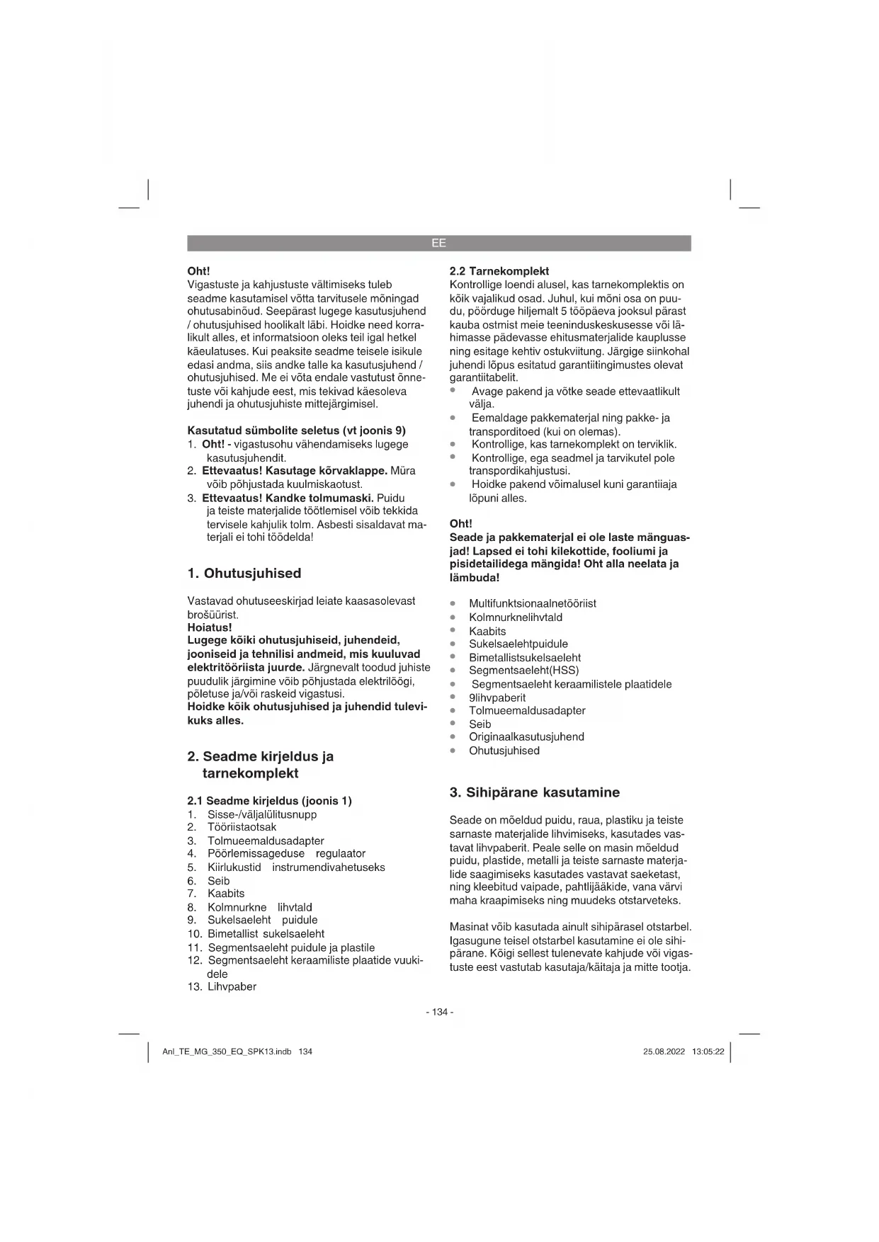 Seade on mõeldud puidu, raua, plastiku ja teiste sarnaste materjalide lihvimiseks, kasutades vas- tavat lihvpaberit. Peale selle on masin mõeldud puidu, plastide, metalli ja teiste sarnaste materja- lide saagimiseks kasutades vastavat saeketast, ning kleebitud vaipade, pahtlijääkide, vana värvi maha kraapimiseks ning muudeks otstarveteks. Masinat võib kasutada ainult sihipärasel otstarbel. Igasugune teisel otstarbel kasutamine ei ole sihi- pärane. Kõigi sellest tulenevate kahjude või vigas- tuste eest vastutab kasutaja/käitaja ja mitte tootja. Anl_TE_MG_350_EQ_SPK13.indb 134Anl_TE_MG_350_EQ_SPK13.indb 134 25.08.2022 13:05:2225.08.2022 13:05:22EE