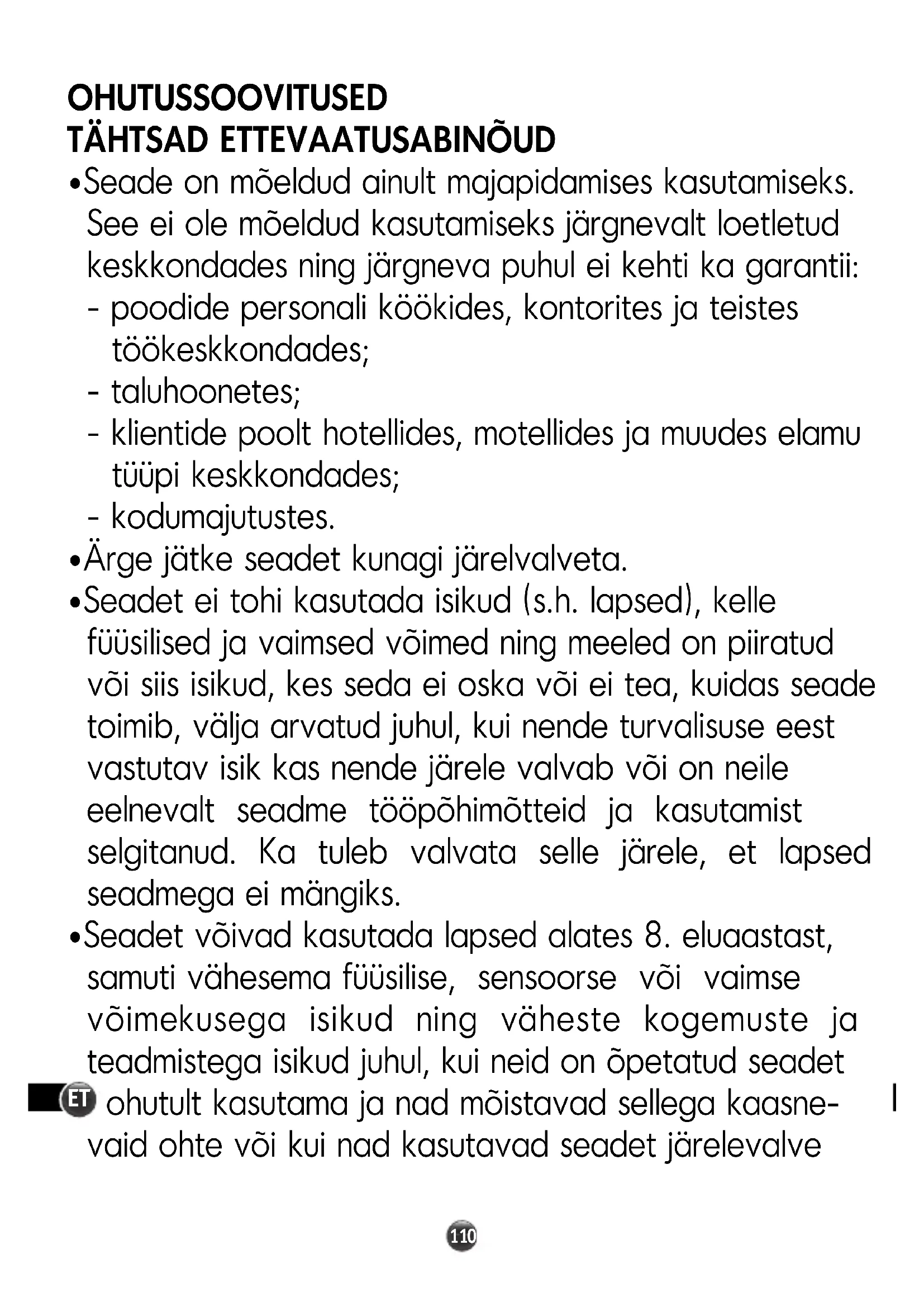 - Seadet ei tohi kasutada isikud (s.h. lapsed), kelle füüsilised ja vaimsed võimed ning meeled on piiratud või siis isikud, kes seda ei oska või ei tea, kuidas seade toimib, välja arvatud juhul, kui nende turvalisuse eest vastutav isik kas nende järele valvab või on neile eelnevalt seadme tööpõhimõtteid ja kasutamist selgitanud. Ka tuleb valvata selle järele, et lapsed seadmega ei mängiks.