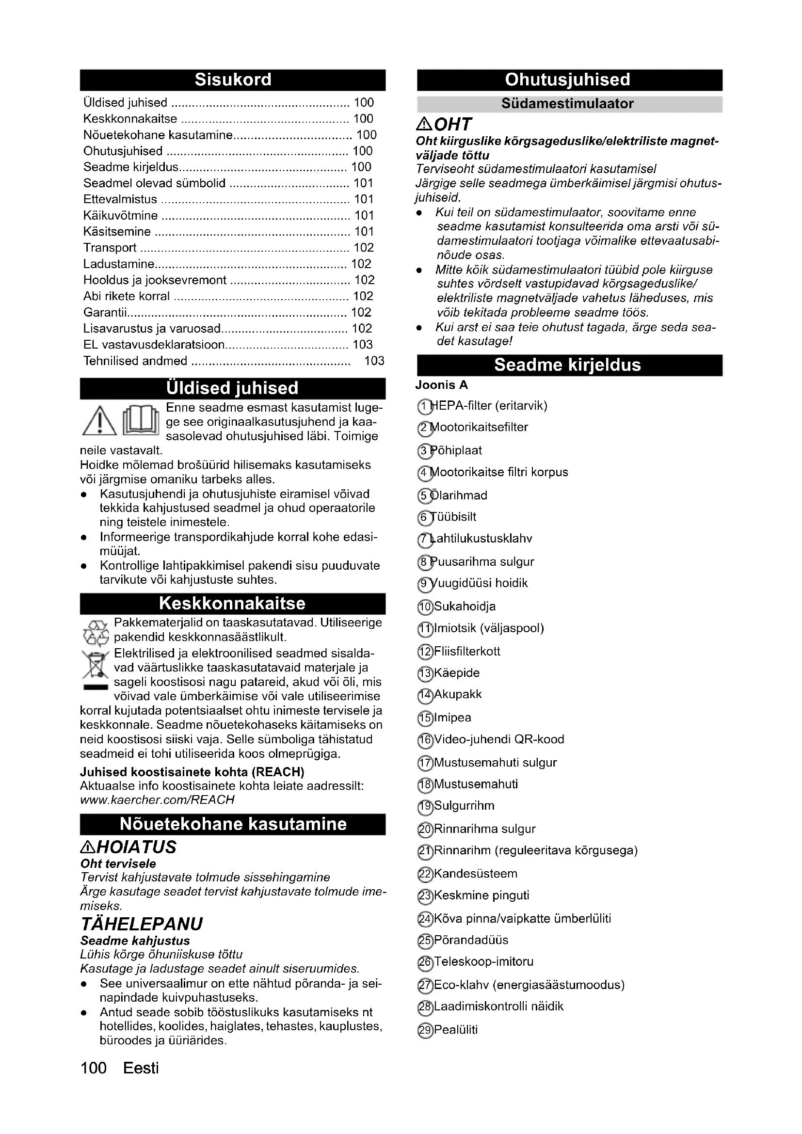 - 0,2100 Eesti Sisukord Üldised juhised Enne seadme esmast kasutamist luge- ge see originaalkasutusjuhend ja kaa- sasolevad ohutusjuhised läbi. Toimige neile vastavalt. Hoidke mõlemad brošüürid hilisemaks kasutamiseks või järgmise omaniku tarbeks alles. ● Kasutusjuhendi ja ohutusjuhiste eiramisel võivad tekkida kahjustused seadmel ja ohud operaatorile ning teistele inimestele. ● Informeerige transpordikahjude korral kohe edasi- müüjat. ● Kontrollige lahtipakkimisel pakendi sisu puuduvate tarvikute või kahjustuste suhtes. Keskkonnakaitse Pakkematerjalid on taaskasutatavad. Utiliseerige pakendid keskkonnasäästlikult. Elektrilised ja elektroonilised seadmed sisalda- vad väärtuslikke taaskasutatavaid materjale ja sageli koostisosi nagu patareid, akud või õli, mis võivad vale ümberkäimise või vale utiliseerimise korral kujutada potentsiaalset ohtu inimeste tervisele ja keskkonnale. Seadme nõuetekohaseks käitamiseks on neid koostisosi siiski vaja. Selle sümboliga tähistatud seadmeid ei tohi utiliseerida koos olmeprügiga. Juhised koostisainete kohta (REACH) Aktuaalse info koostisainete kohta leiate aadressilt: www.kaercher.com/REACH Nõuetekohane kasutamine 몇 HOIATUS Oht tervisele Tervist kahjustavate tolmude sissehingamine Ärge kasutage seadet tervist kahjustavate tolmude ime- miseks. TÄHELEPANU Seadme kahjustus Lühis kõrge õhuniiskuse tõttu Kasutage ja ladustage seadet ainult siseruumides. ● See universaalimur on ette nähtud põranda- ja sei- napindade kuivpuhastuseks. ● Antud seade sobib tööstuslikuks kasutamiseks nt hotellides, koolides, haiglates, tehastes, kauplustes, büroodes ja üüriärides. Ohutusjuhised Südamestimulaator OHT Oht kiirguslike kõrgsageduslike/elektriliste magnet- väljade tõttu Terviseoht südamestimulaatori kasutamisel Järgige selle seadmega ümberkäimisel järgmisi ohutus- juhiseid. ● Kui teil on südamestimulaator, soovitame enne seadme kasutamist konsulteerida oma arsti või sü- damestimulaatori tootjaga võimalike ettevaatusabi- nõude osas. ● Mitte kõik südamestimulaatori tüübid pole kiirguse suhtes võrdselt vastupidavad kõrgsageduslike/ elektriliste magnetväljade vahetus läheduses, mis võib tekitada probleeme seadme töös. ● Kui arst ei saa teie ohutust tagada, ärge seda sea- det kasutage! Seadme kirjeldus Joonis A 1 HEPA-filter (eritarvik) 2 Mootorikaitsefilter 3 Põhiplaat 4 Mootorikaitse filtri korpus 5 Õlarihmad 6 Tüübisilt 7 Lahtilukustusklahv 8 Puusarihma sulgur 9 Vuugidüüsi hoidik 10 Sukahoidja 11 Imiotsik (väljaspool) 12 Fliisfilterkott 13 Käepide 14 Akupakk 15 Imipea 16 Video-juhendi QR-kood 17 Mustusemahuti sulgur 18 Mustusemahuti 19 Sulgurrihm 20 Rinnarihma sulgur 21 Rinnarihm (reguleeritava kõrgusega) 22 Kandesüsteem 23 Keskmine pinguti 24 Kõva pinna/vaipkatte ümberlüliti 25 Põrandadüüs 26 Teleskoop-imitoru 27 Eco-klahv (energiasäästumoodus) 28 Laadimiskontrolli näidik 29 Pealüliti Üldised juhised p. 100