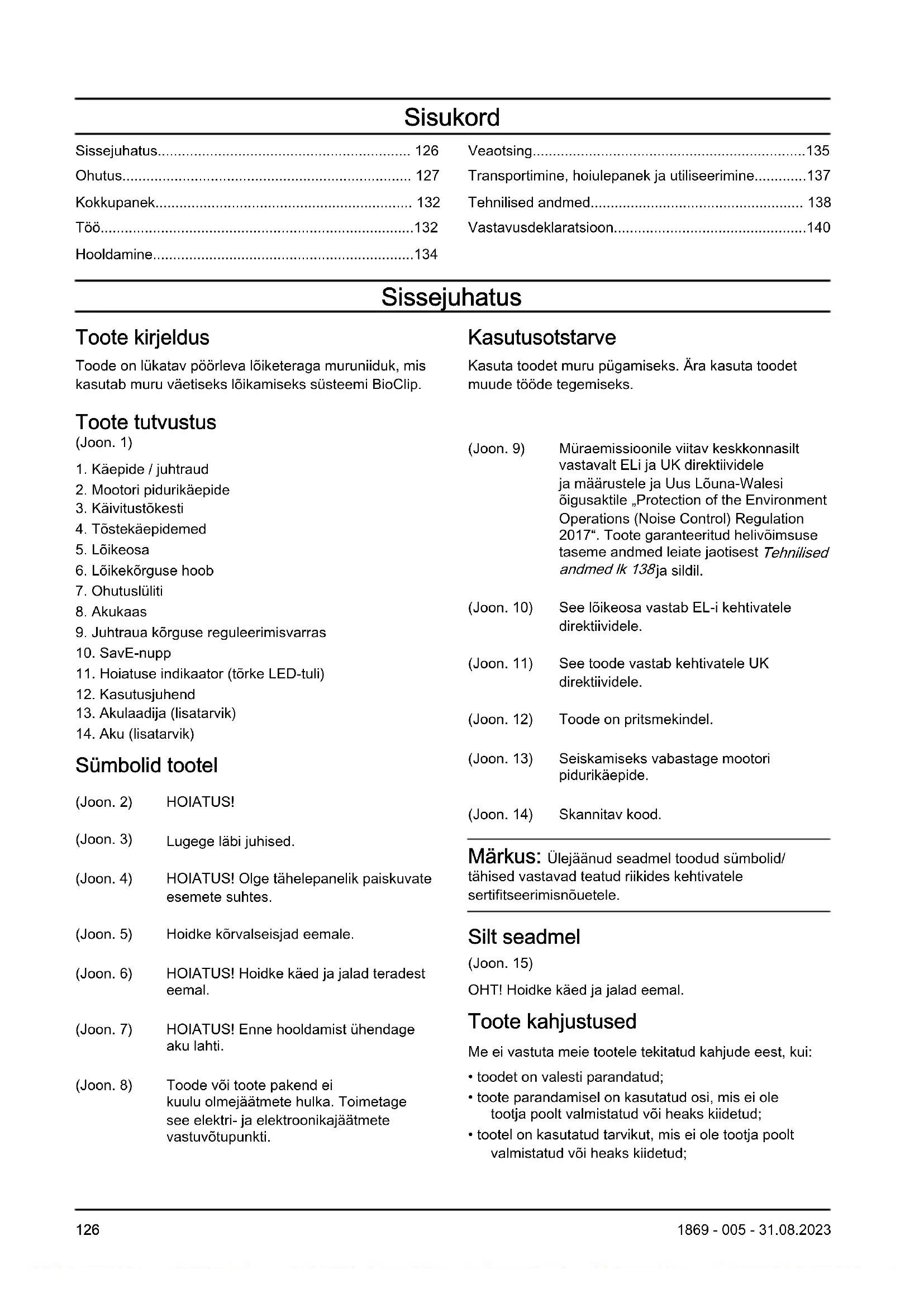 Sümbolid tootel (Joon. 2) HOIATUS! (Joon. 3) Lugege läbi juhised. (Joon. 4) HOIATUS! Olge tähelepanelik paiskuvate esemete suhtes. (Joon. 5) Hoidke kõrvalseisjad eemale. (Joon. 6) HOIATUS! Hoidke käed ja jalad teradest eemal. (Joon. 7) HOIATUS! Enne hooldamist ühendage aku lahti. (Joon. 8) Toode või toote pakend ei kuulu olmejäätmete hulka. Toimetage see elektri- ja elektroonikajäätmete vastuvõtupunkti. (Joon. 9) Müraemissioonile viitav keskkonnasilt vastavalt ELi ja UK direktiividele ja määrustele ja Uus Lõuna-Walesi õigusaktile „Protection of the Environment Operations (Noise Control) Regulation 2017“. Toote garanteeritud helivõimsuse taseme andmed leiate jaotisest Tehnilised andmed lk 138 ja sildil. (Joon. 10) See lõikeosa vastab EL-i kehtivatele direktiividele. (Joon. 11) See toode vastab kehtivatele UK direktiividele. (Joon. 12) Toode on pritsmekindel. (Joon. 13) Seiskamiseks vabastage mootori pidurikäepide. (Joon. 14) Skannitav kood. Märkus: Ülejäänud seadmel toodud sümbolid/ tähised vastavad teatud riikides kehtivatele sertifitseerimisnõuetele. Silt seadmel (Joon. 15) OHT! Hoidke käed ja jalad eemal. Toote kahjustused Me ei vastuta meie tootele tekitatud kahjude eest, kui: