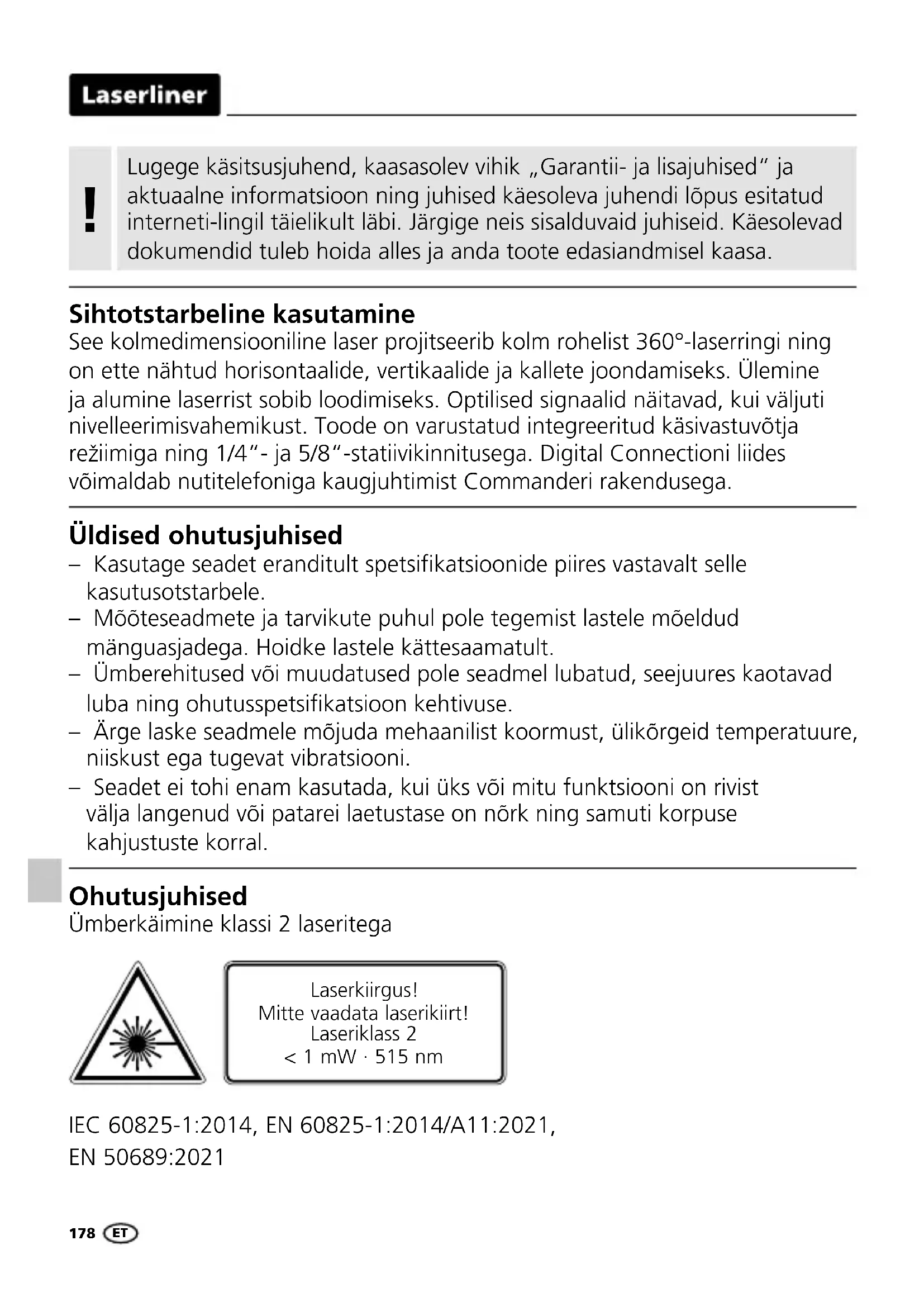 Sihtotstarbeline kasutamine See kolmedimensiooniline laser projitseerib kolm rohelist 360°-laserringi ning on ette nähtud horisontaalide, vertikaalide ja kallete joondamiseks. Ülemine ja alumine laserrist sobib loodimiseks. Optilised signaalid näitavad, kui väljuti nivelleerimisvahemikust. Toode on varustatud integreeritud käsivastuvõtja režiimiga ning 1/4“- ja 5/8“-statiivikinnitusega. Digital Connectioni liides võimaldab nutitelefoniga kaugjuhtimist Commanderi rakendusega. Üldised ohutusjuhised – Kasutage seadet eranditult spetsikatsioonide piires vastavalt selle kasutusotstarbele. – Mõõteseadmete ja tarvikute puhul pole tegemist lastele mõeldud mänguasjadega. Hoidke lastele kättesaamatult. – Ümberehitused või muudatused pole seadmel lubatud, seejuures kaotavad luba ning ohutusspetsikatsioon kehtivuse. – Ärge laske seadmele mõjuda mehaanilist koormust, ülikõrgeid temperatuure, niiskust ega tugevat vibratsiooni. – Seadet ei tohi enam kasutada, kui üks või mitu funktsiooni on rivist välja langenud või patarei laetustase on nõrk ning samuti korpuse kahjustuste korral. Ohutusjuhised Ümberkäimine klassi 2 laseritega Laserkiirgus! Mitte vaadata laserikiirt! Laseriklass 2 < 1 mW · 515 nm IEC 60825-1:2014, EN 60825-1:2014/A11:2021, EN 50689:2021CompactPlane-Laser 3G