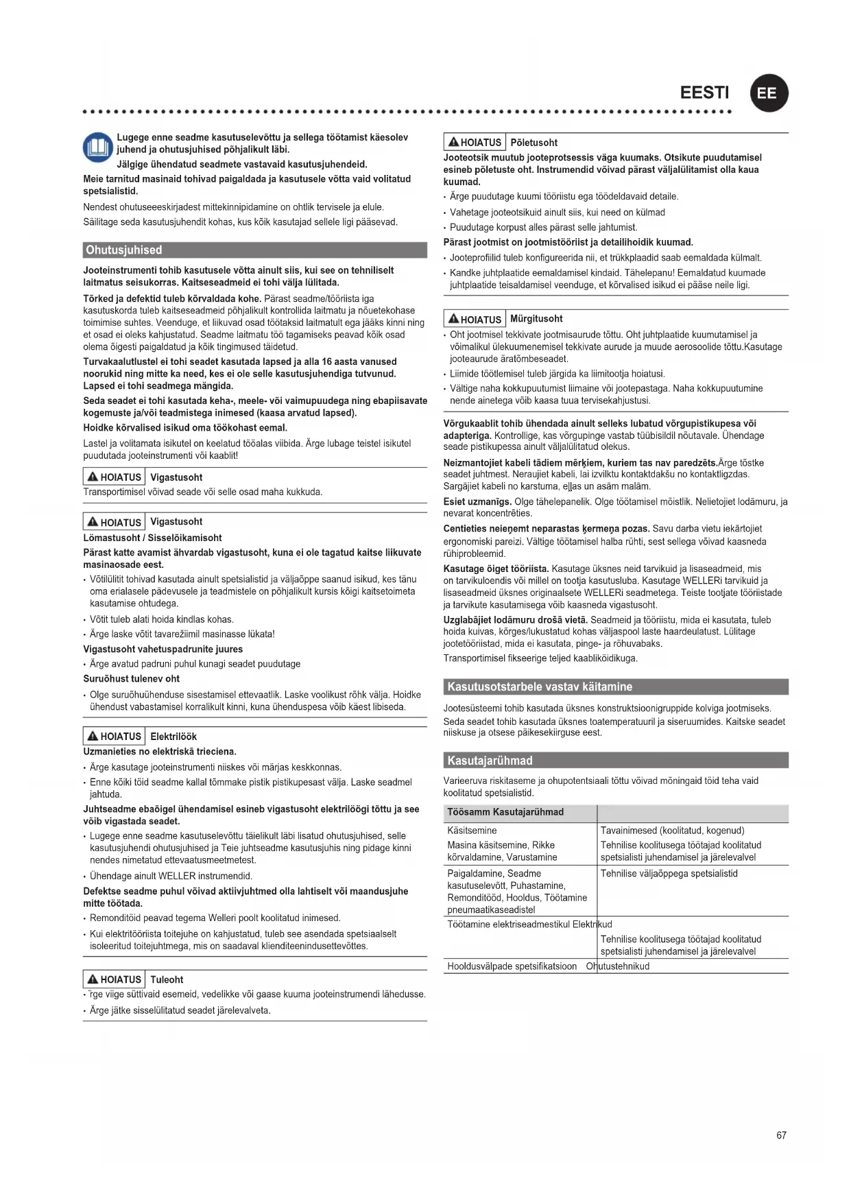 - Vältige naha kokkupuutumist liimaine või jootepastaga. Naha kokkupuutumine nende ainetega võib kaasa tuua tervisekahjustusi. Võrgukaablit tohib ühendada ainult selleks lubatud võrgupistikupesa või adapteriga. Kontrollige, kas võrgupinge vastab tüübisildil nõutavale. Ühendage seade pistikupessa ainult väljalülitatud olekus. Neizmantojiet kabeli tādiem mērķiem, kuriem tas nav paredzēts.Ärge tõstke seadetjuhtmest.Neraujietkabeli,laiizvilktukontaktdakšunokontaktligzdas. Sargājietkabelinokarstuma,eļļasunasāmmalām. Esiet uzmanīgs. Olgetähelepanelik.Olgetöötamiselmõistlik.Nelietojietlodāmuru,ja nevaratkoncentrēties. Centieties neieņemt neparastas ķermeņa pozas. Savudarbavietuiekārtojiet ergonomiski pareizi. Vältige töötamisel halba rühti, sest sellega võivad kaasneda rühiprobleemid. Kasutage õiget tööriista. Kasutage üksnes neid tarvikuid ja lisaseadmeid, mis on tarvikuloendis või millel on tootja kasutusluba. Kasutage WELLERi tarvikuid ja lisaseadmeid üksnes originaalsete WELLERi seadmetega. Teiste tootjate tööriistade ja tarvikute kasutamisega võib kaasneda vigastusoht. Uzglabājiet lodāmuru drošā vietā. Seadmeid ja tööriistu, mida ei kasutata, tuleb hoida kuivas, kõrges/lukustatud kohas väljaspool laste haardeulatust. Lülitage jootetööriistad, mida ei kasutata, pinge- ja rõhuvabaks. Transportimiselkseerigeteljedkaabliköidikuga. Kasutusotstarbele vastav käitamine Jootesüsteemi tohib kasutada üksnes konstruktsioonigruppide kolviga jootmiseks. Seda seadet tohib kasutada üksnes toatemperatuuril ja siseruumides. Kaitske seadet niiskuse ja otsese päikesekiirguse eest. Kasutajarühmad Varieeruva riskitaseme ja ohupotentsiaali tõttu võivad mõningaid töid teha vaid koolitatud spetsialistid. Töösamm Kasutajarühmad Käsitsemine Masina käsitsemine, Rikke kõrvaldamine, Varustamine Tavainimesed (koolitatud, kogenud) Tehnilise koolitusega töötajad koolitatud spetsialisti juhendamisel ja järelevalvel Paigaldamine, Seadme kasutuselevõtt, Puhastamine, Remonditööd, Hooldus, Töötamine pneumaatikaseadistel Tehnilise väljaõppega spetsialistid Töötamine elektriseadmestikul Elektrikud Tehnilise koolitusega töötajad koolitatud spetsialisti juhendamisel ja järelevalvel Hooldusvälpadespetsikatsioon Ohutustehnikud