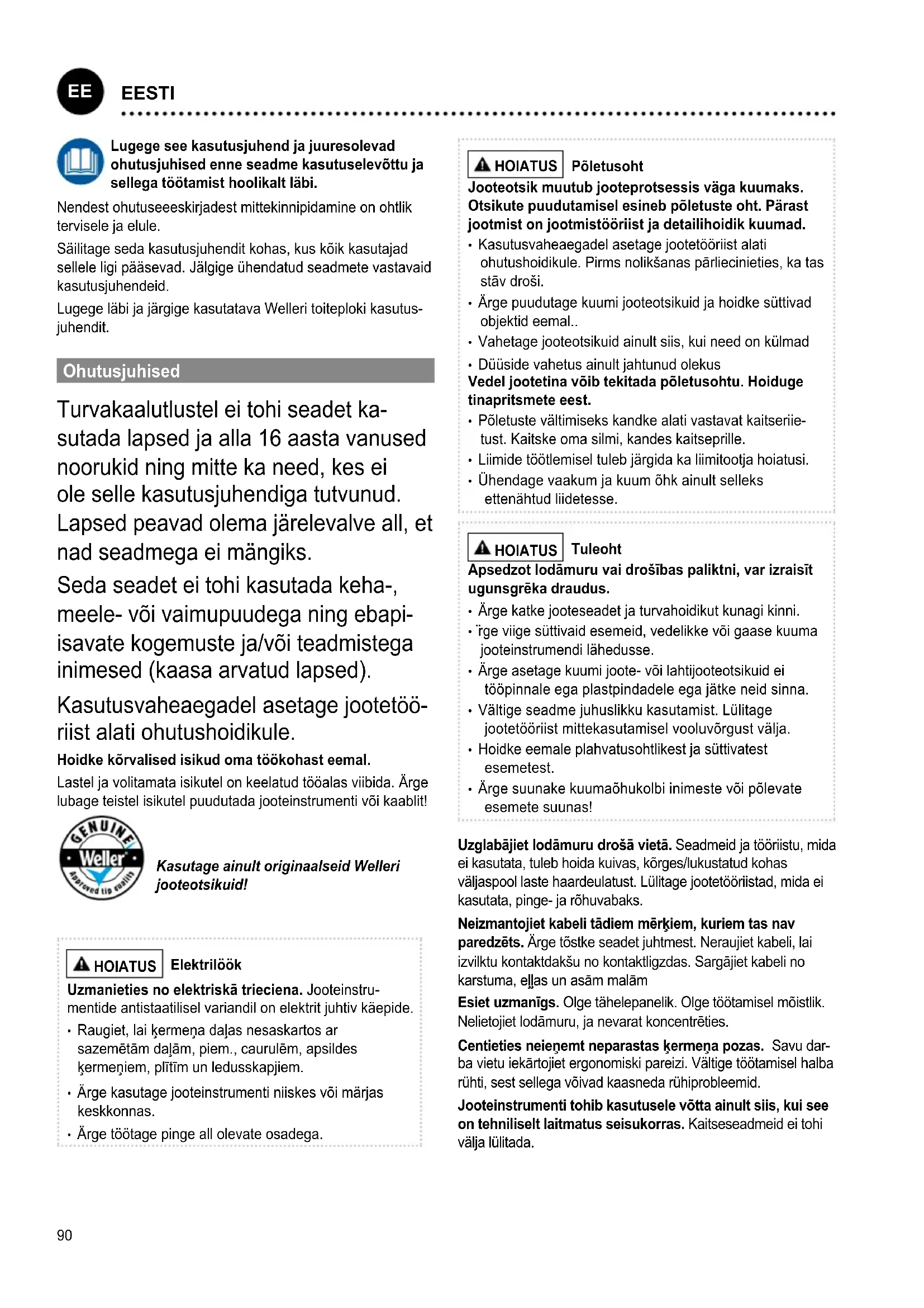 riist alati ohutushoidikule. Hoidke kõrvalised isikud oma töökohast eemal. Lastel ja volitamata isikutel on keelatud tööalas viibida. Ärge lubage teistel isikutel puudutada jooteinstrumenti või kaablit! Kasutage ainult originaalseid Welleri jooteotsikuid! HOIATUS Elektrilöök Uzmanieties no elektriskā trieciena. Jooteinstru- mentide antistaatilisel variandil on elektrit juhtiv käepide.